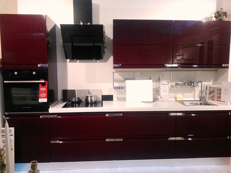 Данный кухонный гарнитур выполнен в темно-бордовом оттенке. Фасады кухни украшены легким глянцевым блеском. Имеется ниша для духового шкафа. Кухня оснащена широкой белой столешницей.