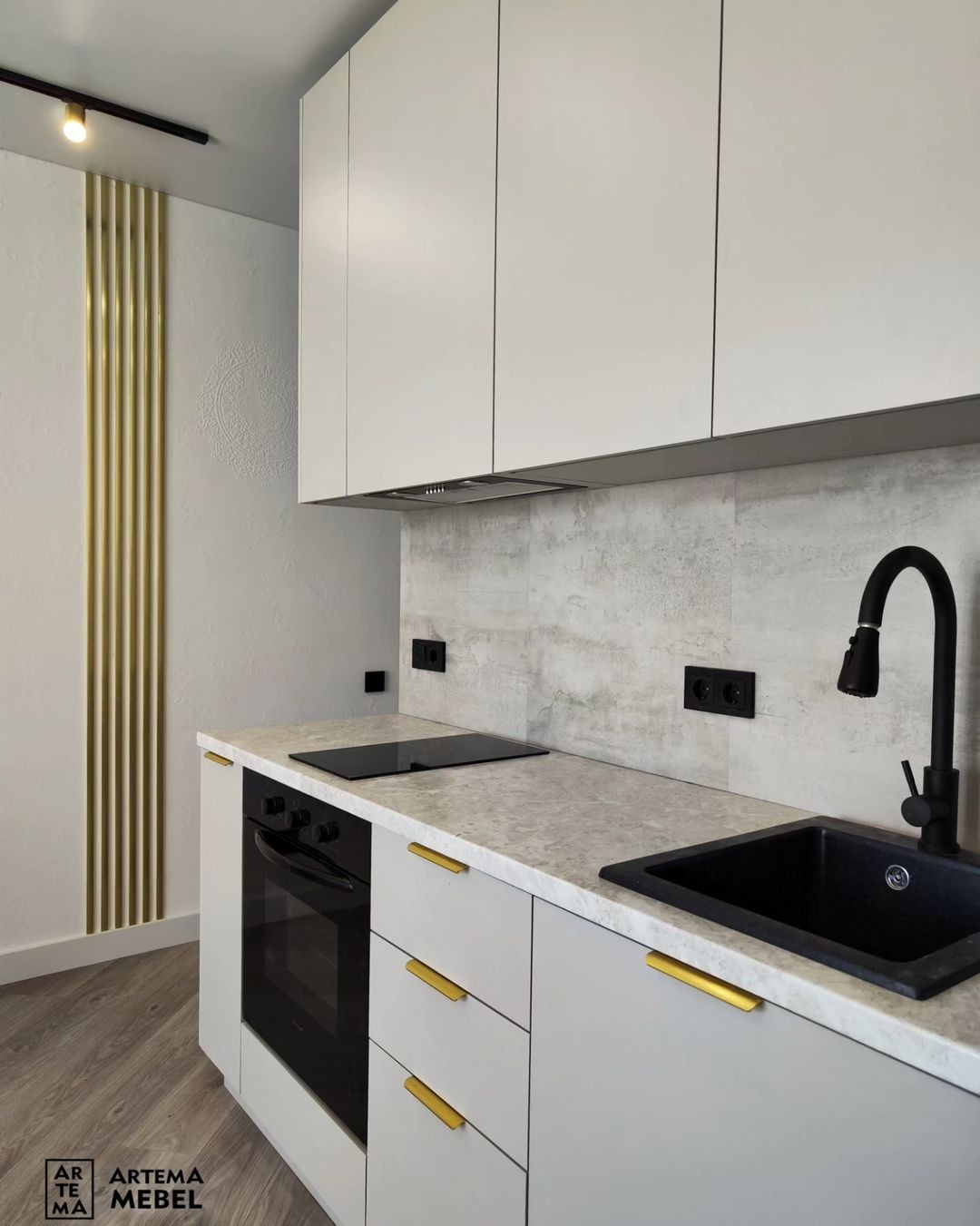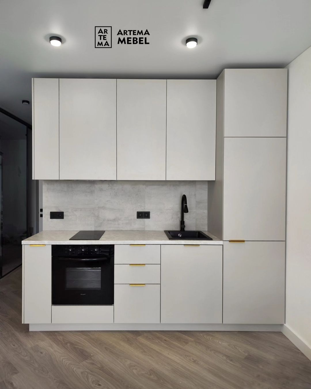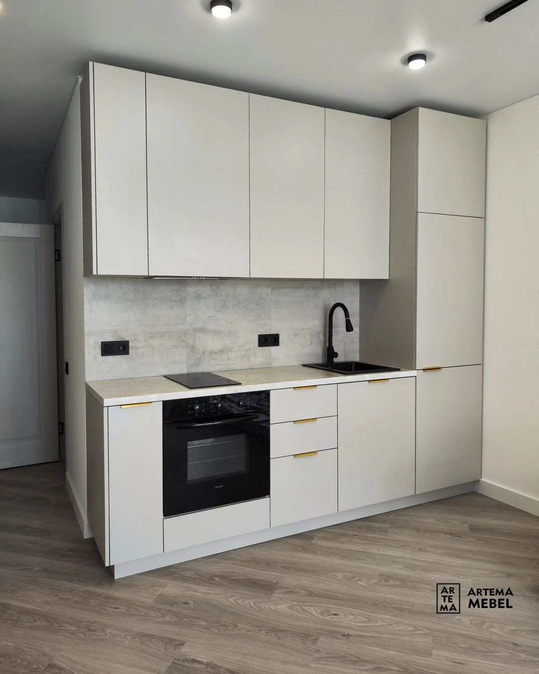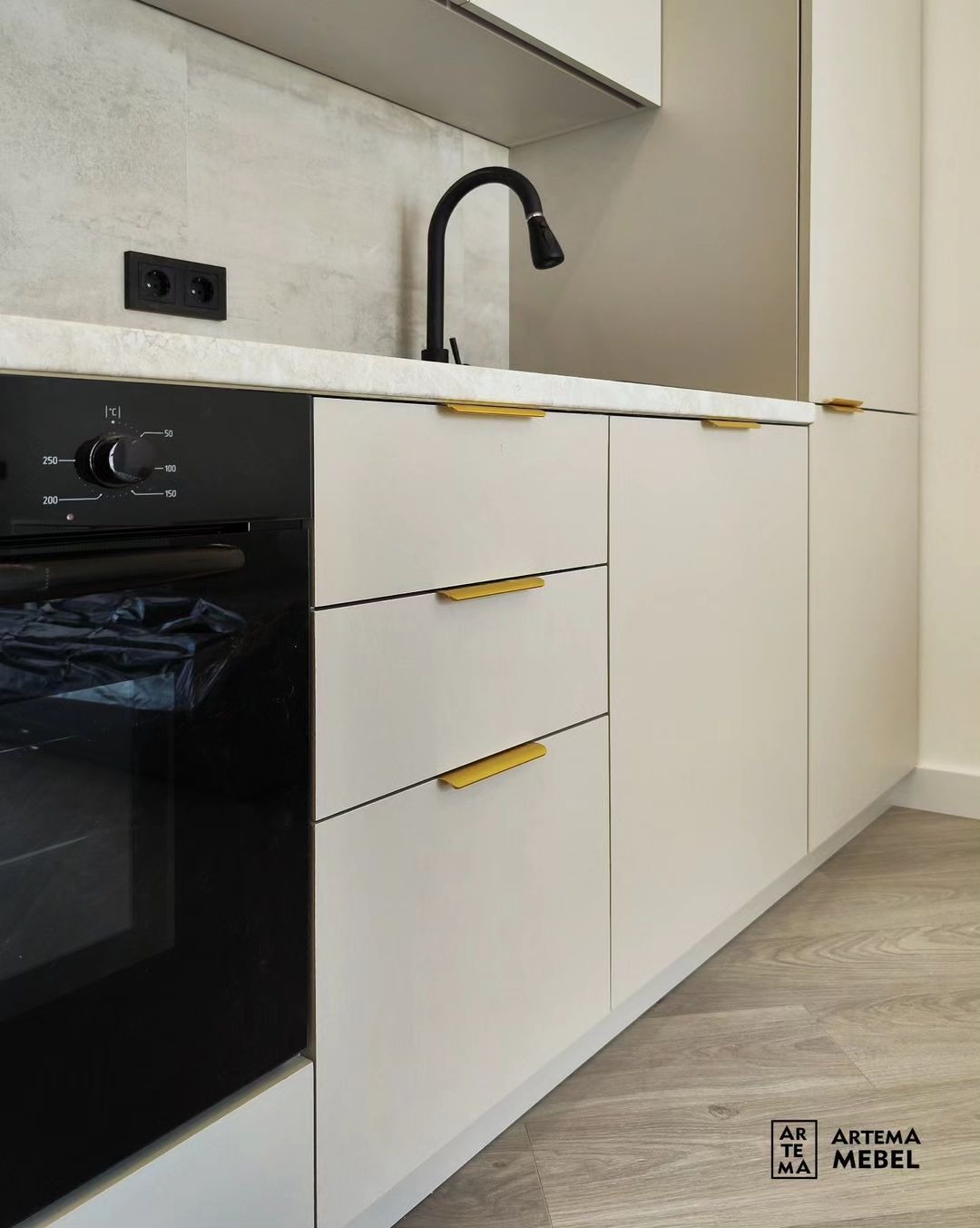 Удлиненные ручки из металла. Глухие фасады из матовой ЛДСП.