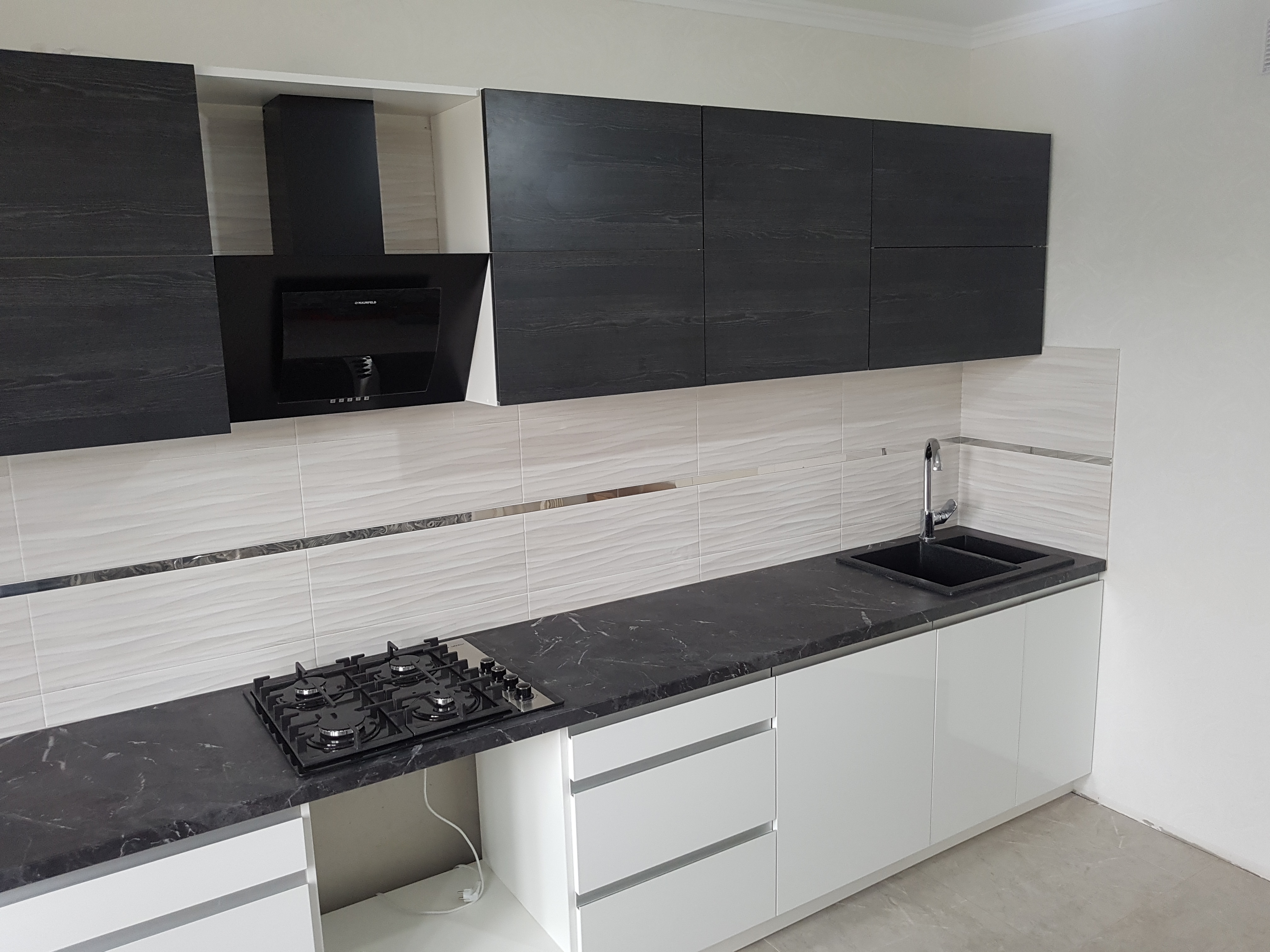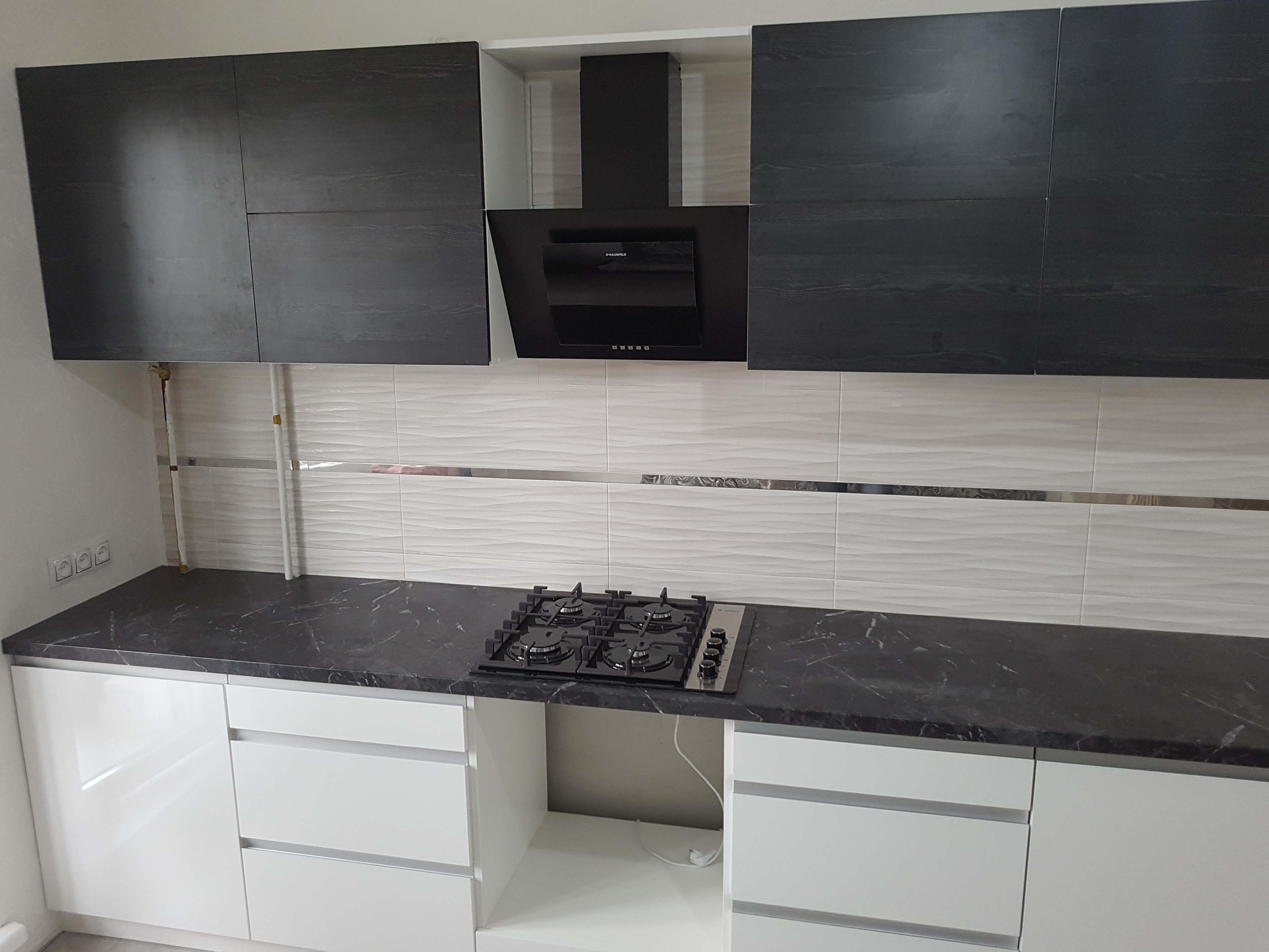 код 108711Контрастное сочетание цветов, фасады без ручек, фартук выполнен плиткой.