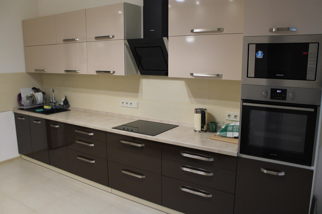 Изящная линейная кухня из пластикового МДФ с оригинальным дизайном. Фасады оформлены в гармоничном сочетании оттенков венге и бежевого.