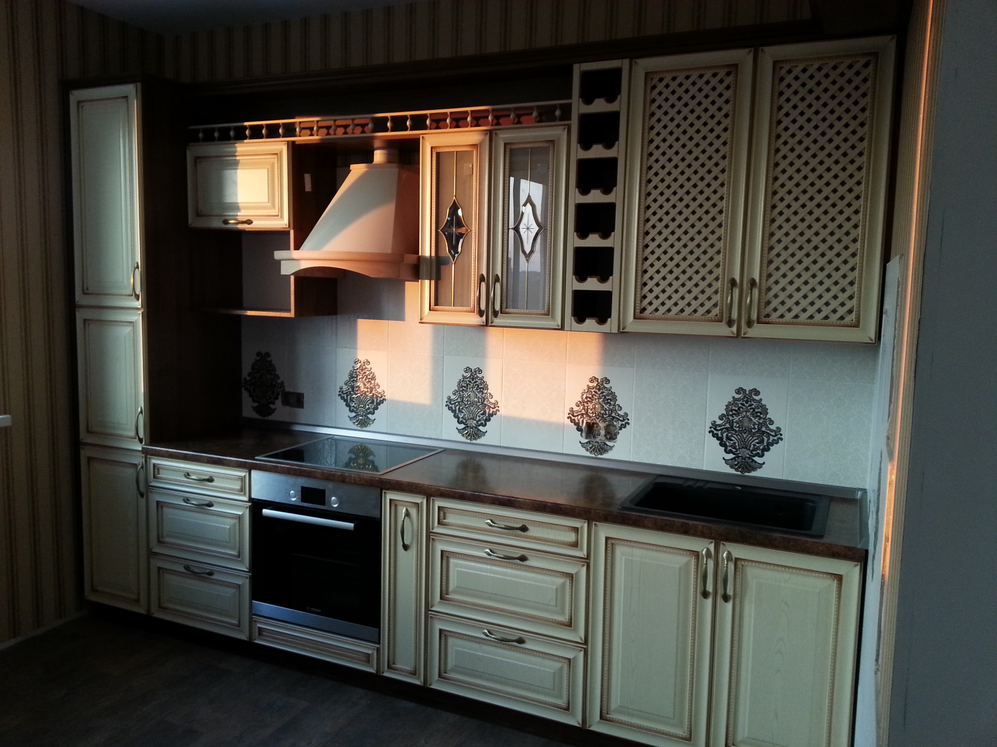 код 86675Светлые фасады с решетками и филенками в патине из рамочного МДФ. Столешница под дерево.