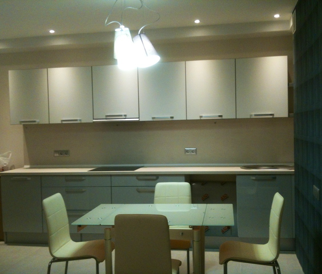 Фасад - крашеный МДФ, корпус - ДСП 16 мм, столешница - «марс глянец» с алюминиевой кромкой.