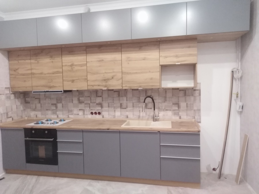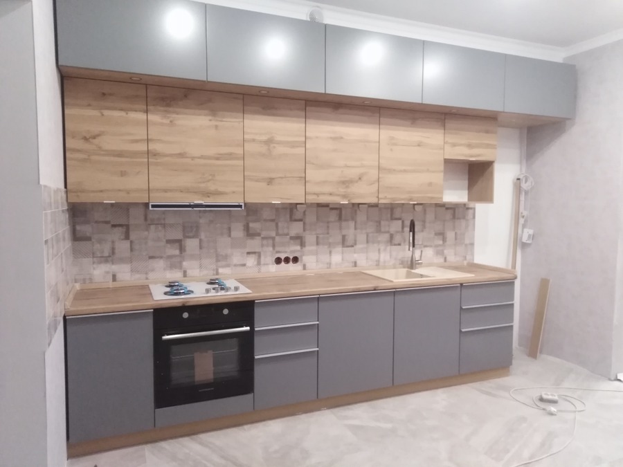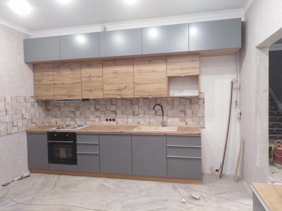Комбинированные фасады из МДФ. Ширина кухни 260 см.