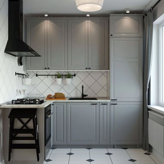 Малогабаритная угловая кухня с серыми матовыми фасадами