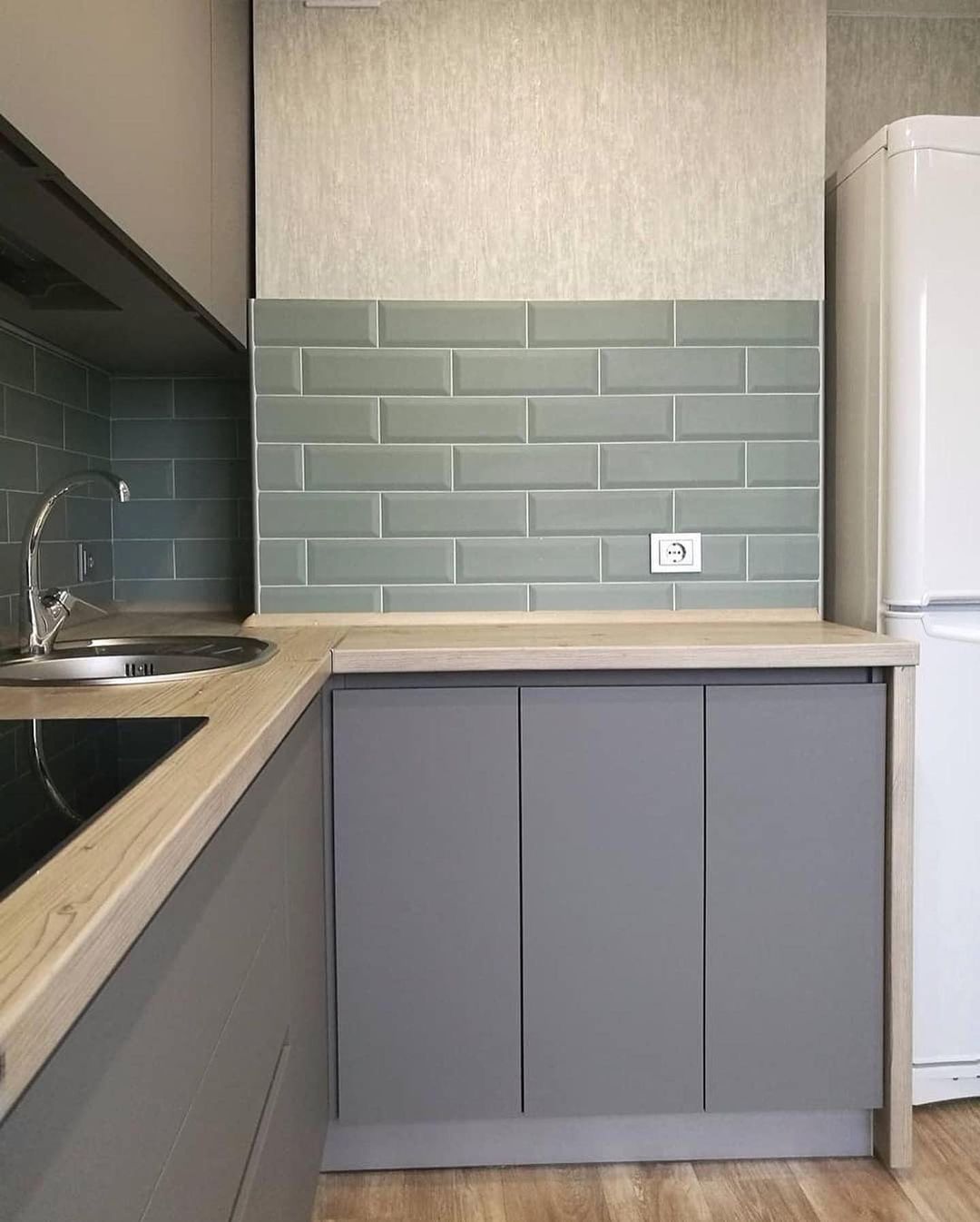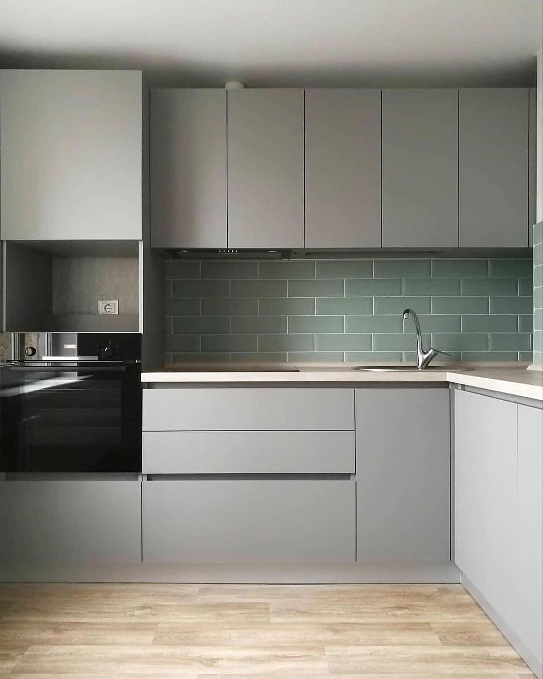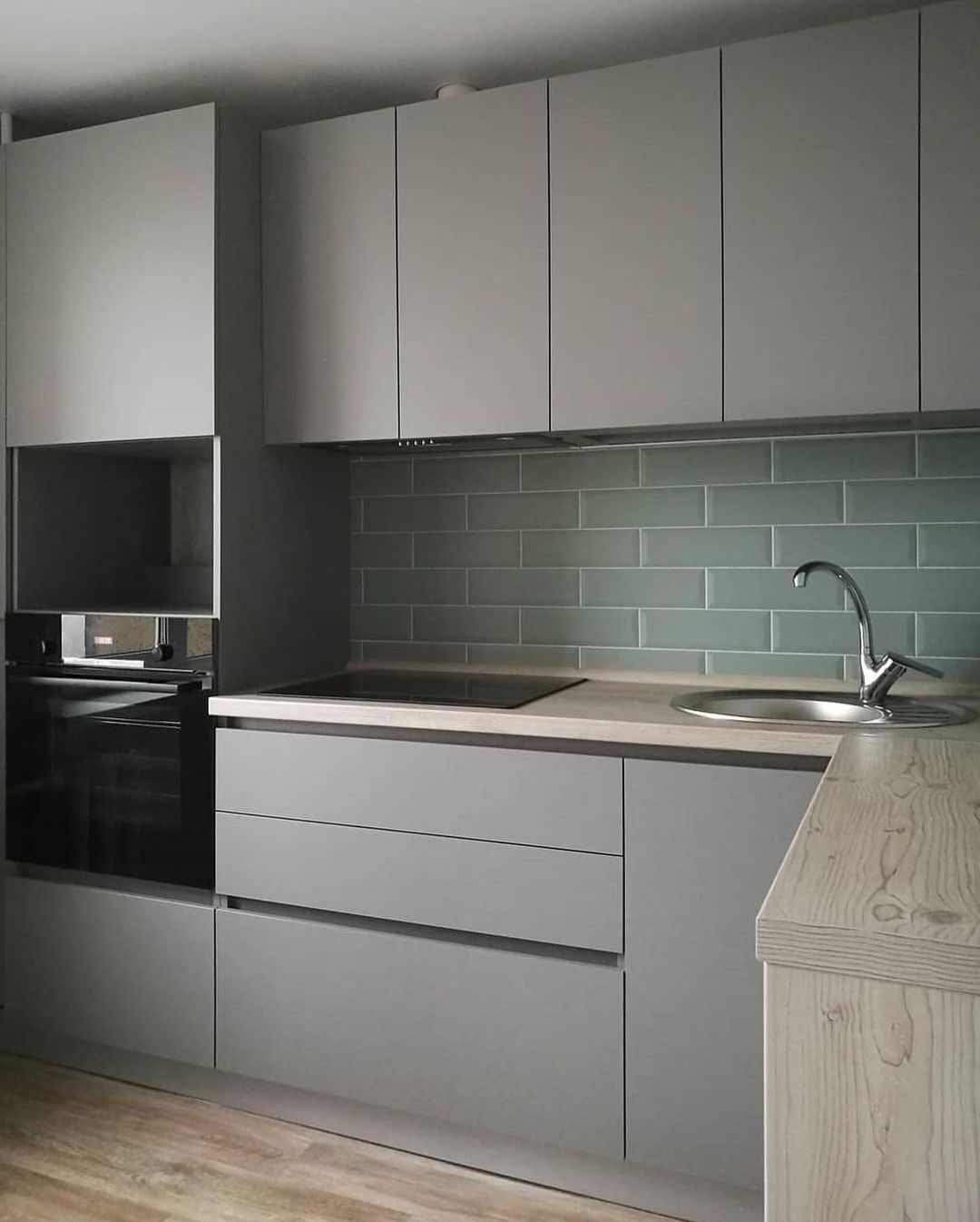 Матовые серые фасады без ручек придают кухне современный и стильный вид.