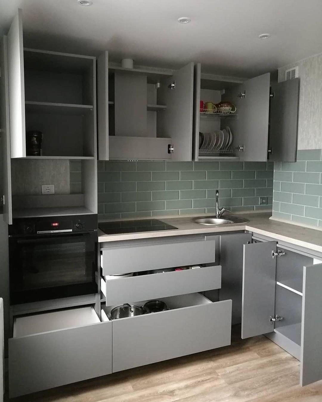 Серый цвет фасадов является универсальным и легко сочетается с другими оттенками интерьера.