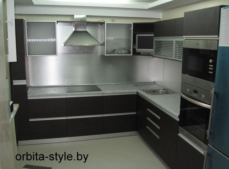 Лаконичный и стильный мебельный набор для кухни в черном цвете. Большинство фасадов матовые, часть верхних модулей дополнено гофрированным остеклением. Фурнитура плоская, вогнутая, серебристого цвета, выполнена из хрома, присутствуют ниши для хранения техники.