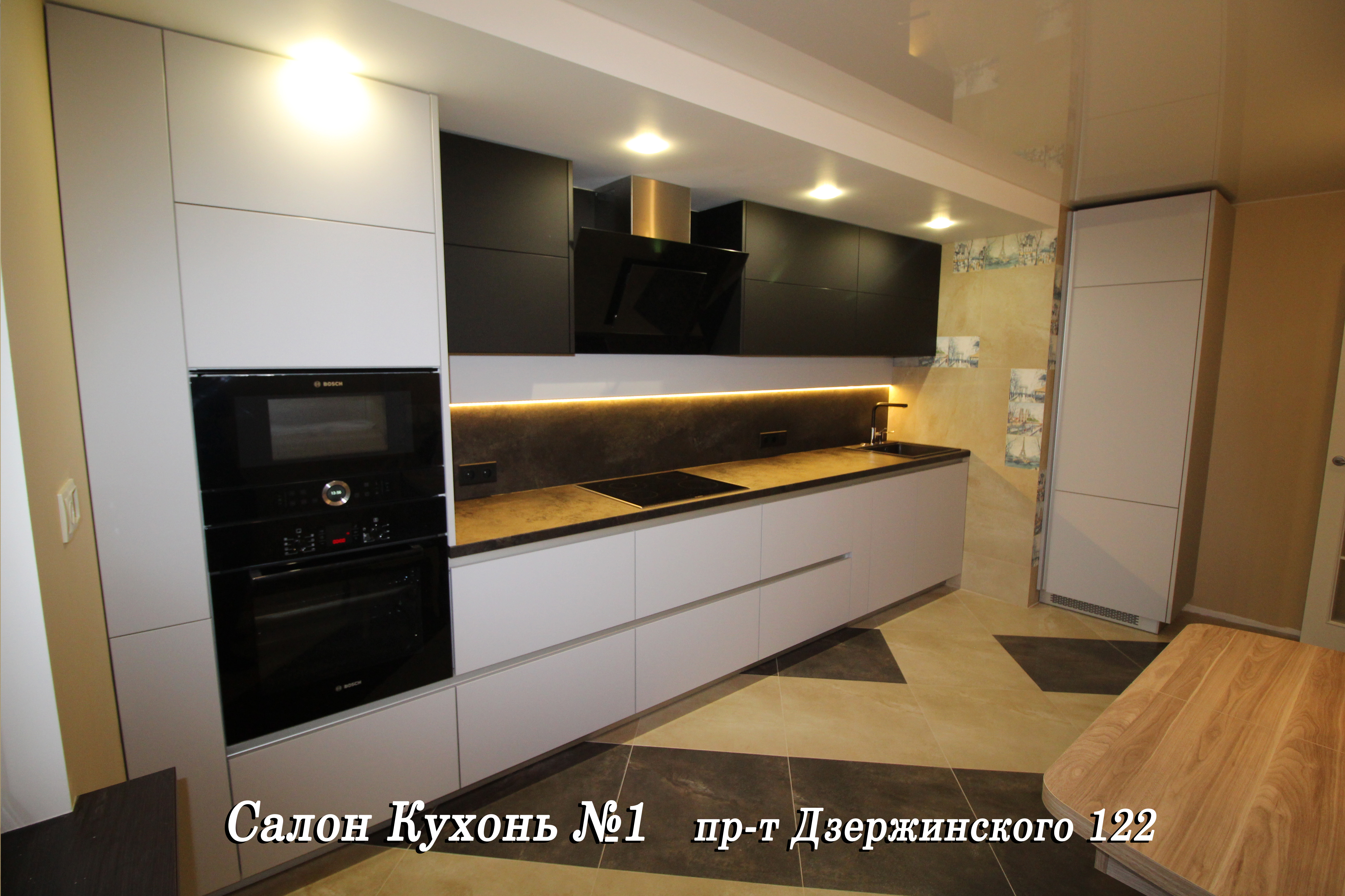 Отсутствие фурнитуры в этом линейном комплекте подчеркивает цельность мебельного набора. Матовые фасады выполнены в двух цветах: черном и белом, что добавляет игры пространства. Над рабочей поверхностью столешницы располагается удобная точечная подсветка. Кроме цельного гарнитура с множеством ящиков и встроенных ниш для техники, комплект дополнительно оснащен высоким шкафчиком.