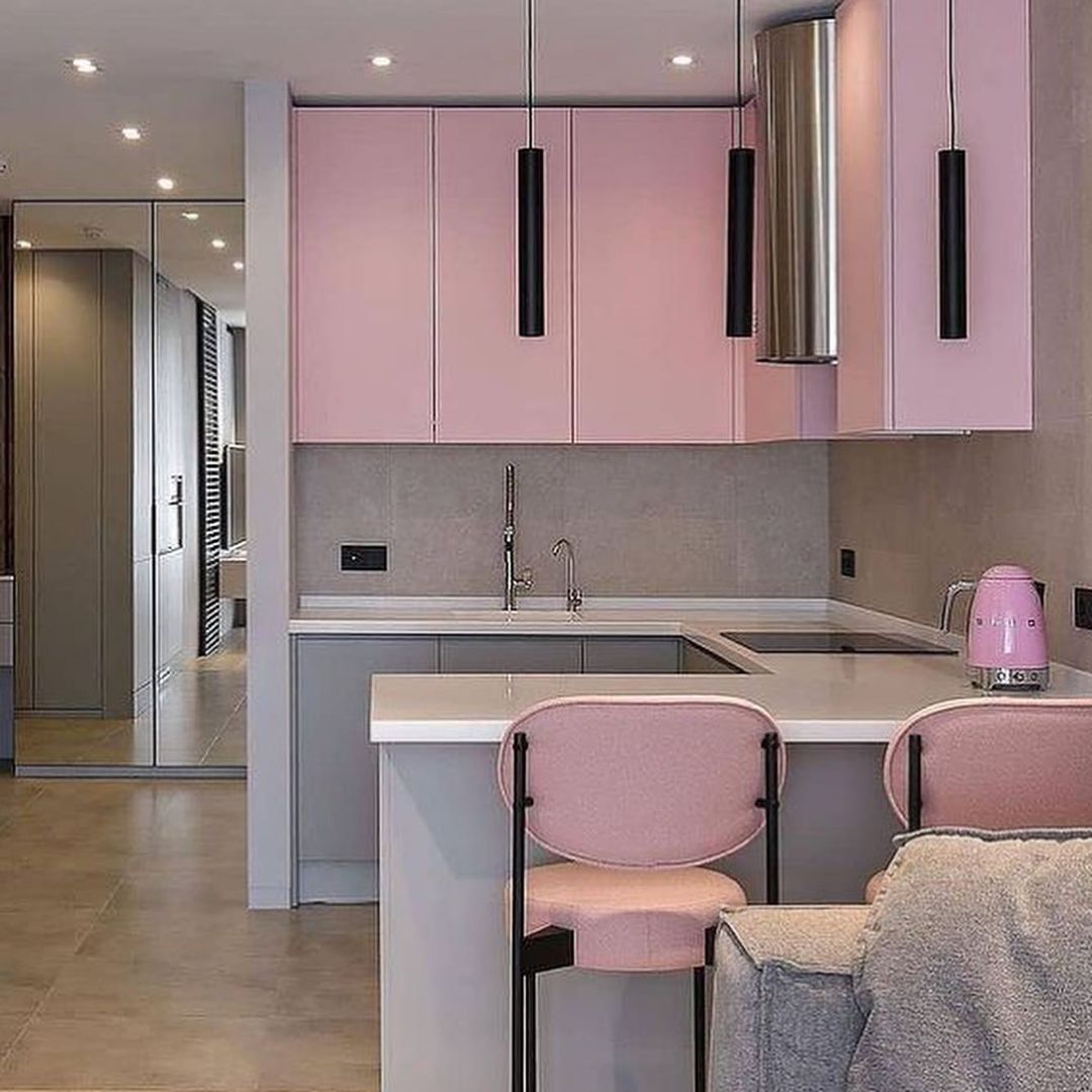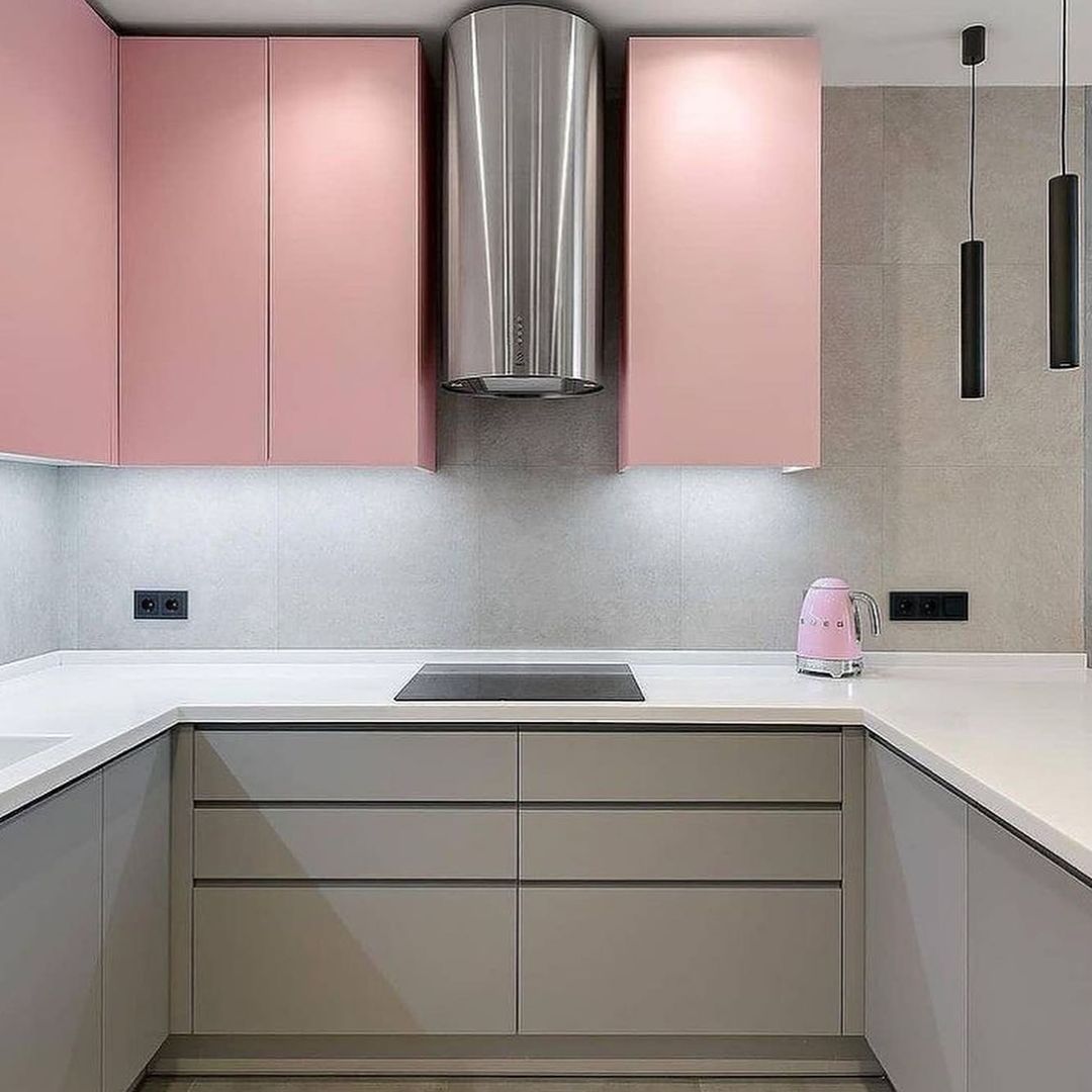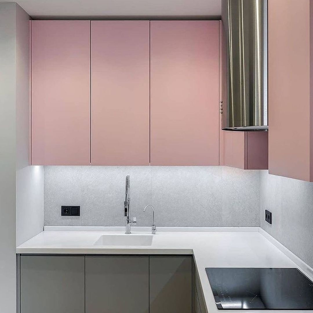 Гармоничное сочетание цветов, фасады без ручек, подсветка.