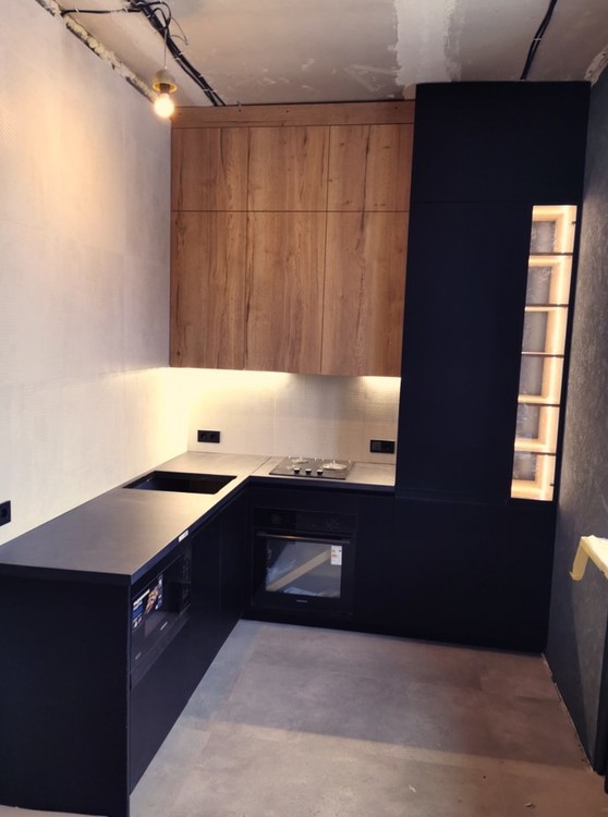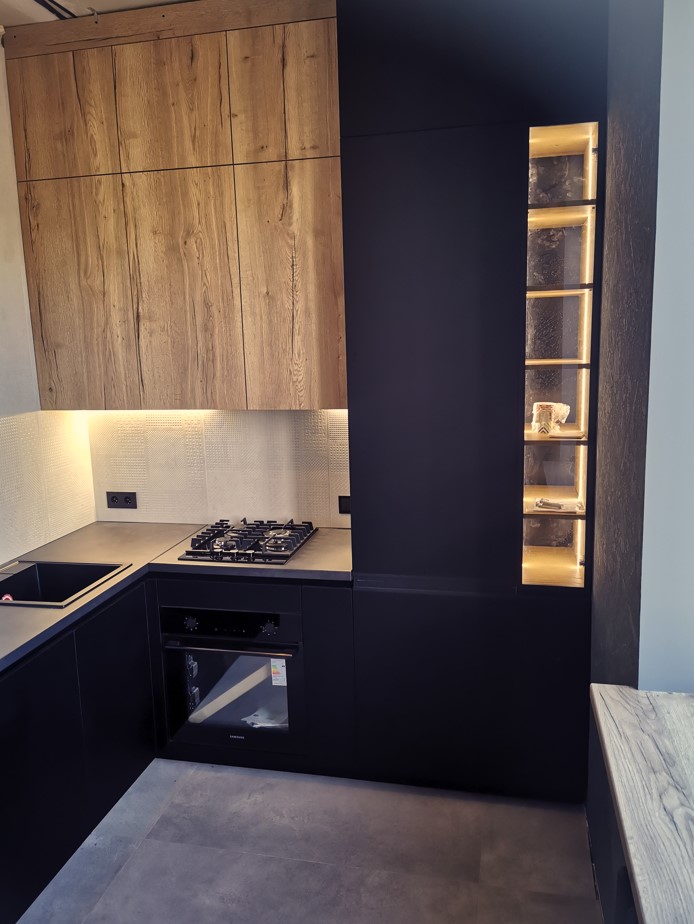 Возле встроенного холодильника предусмотрен пенал-витрина с подсветкой