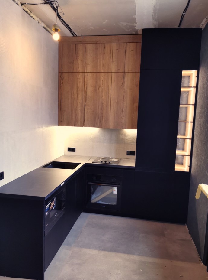 Современный кухонный гарнитур из ДСП в скандинавском стиле.