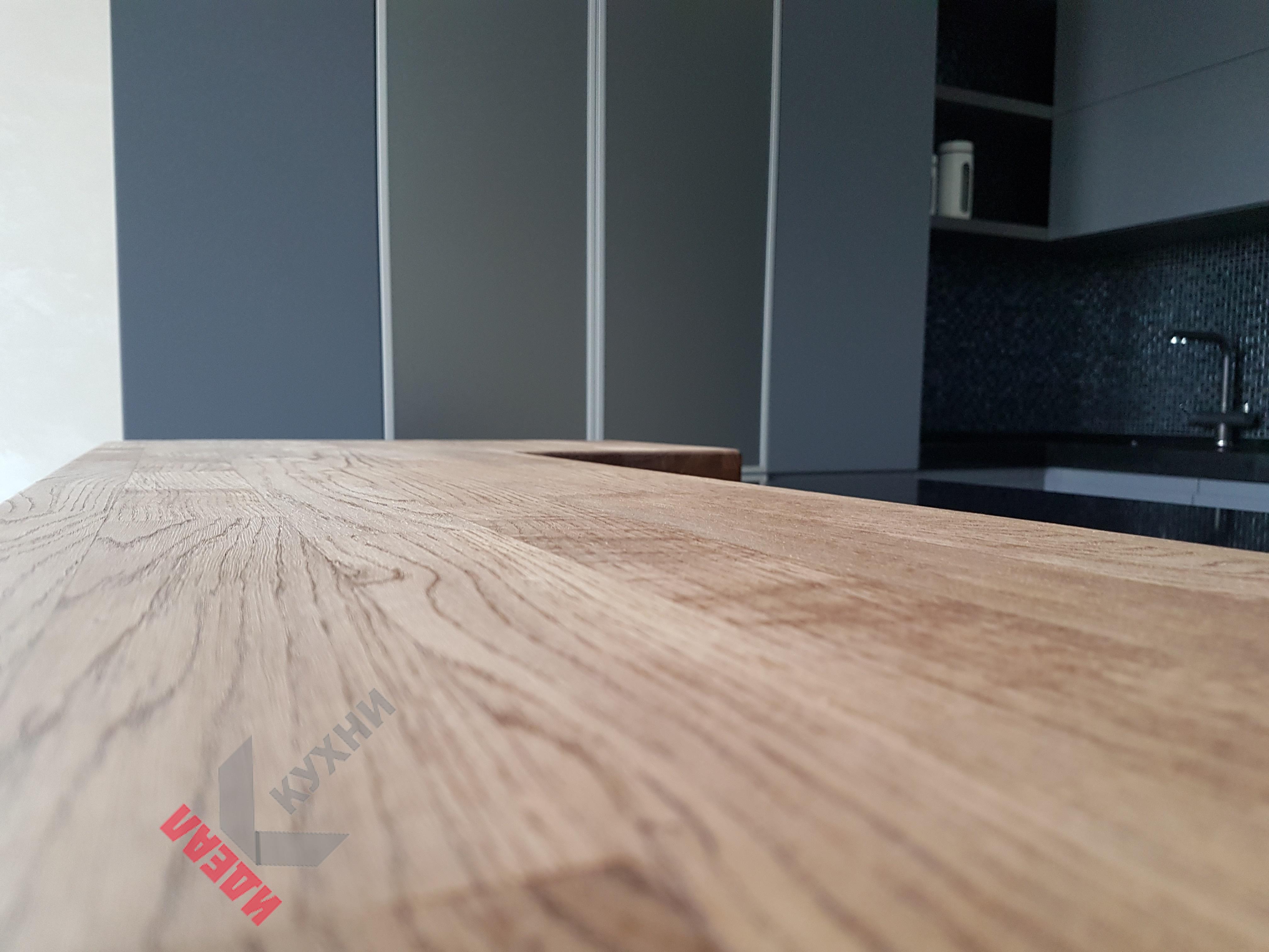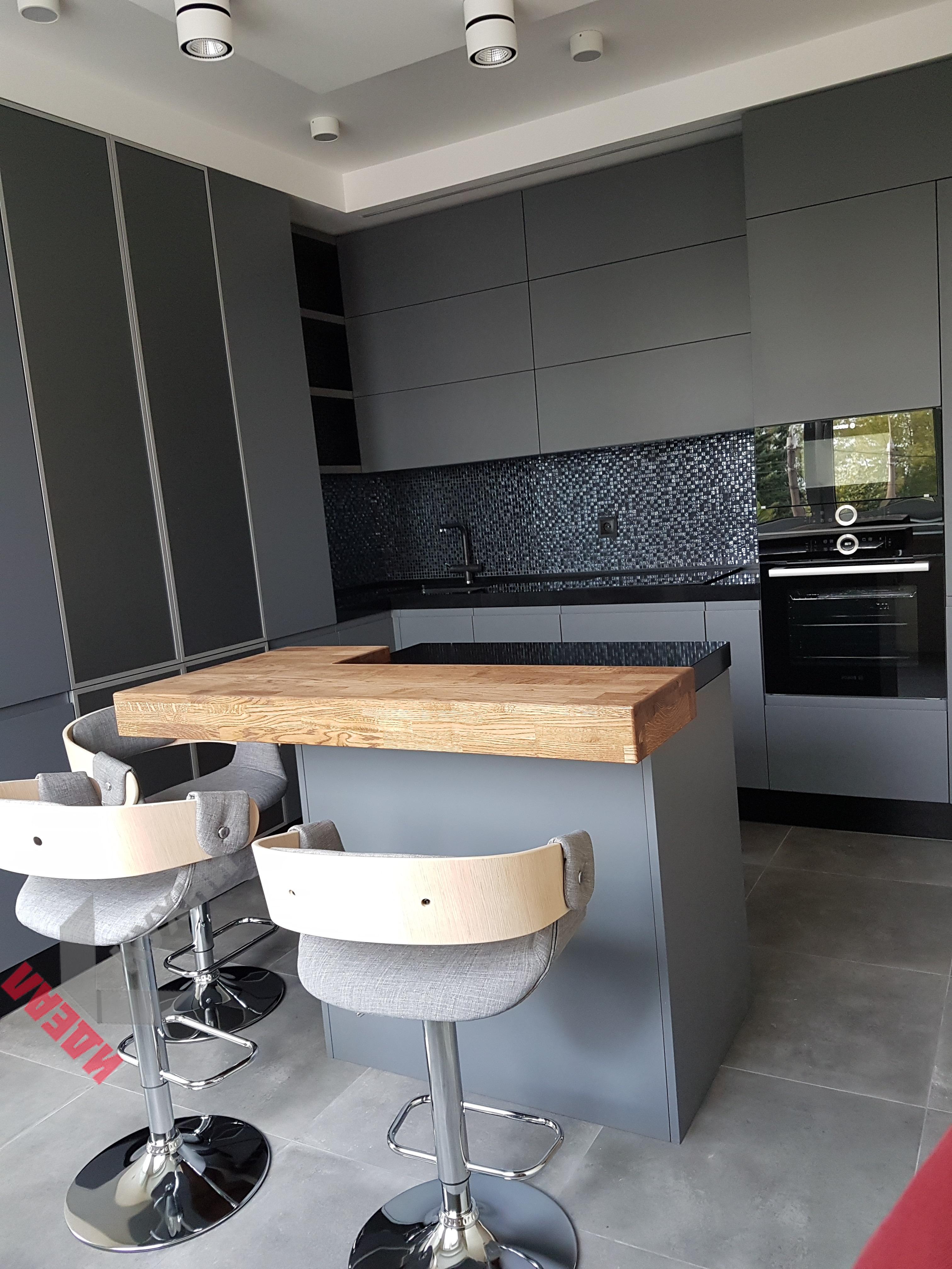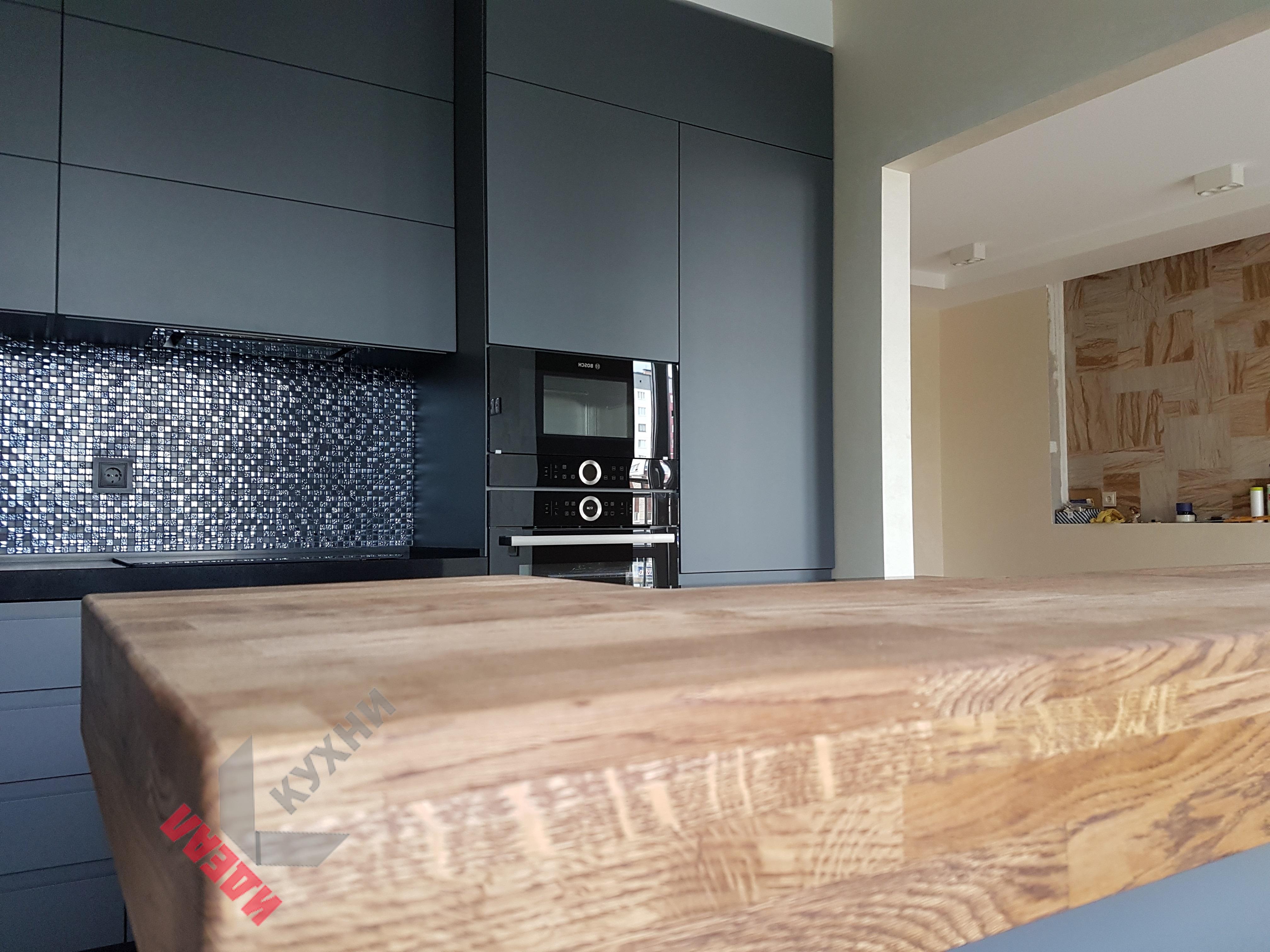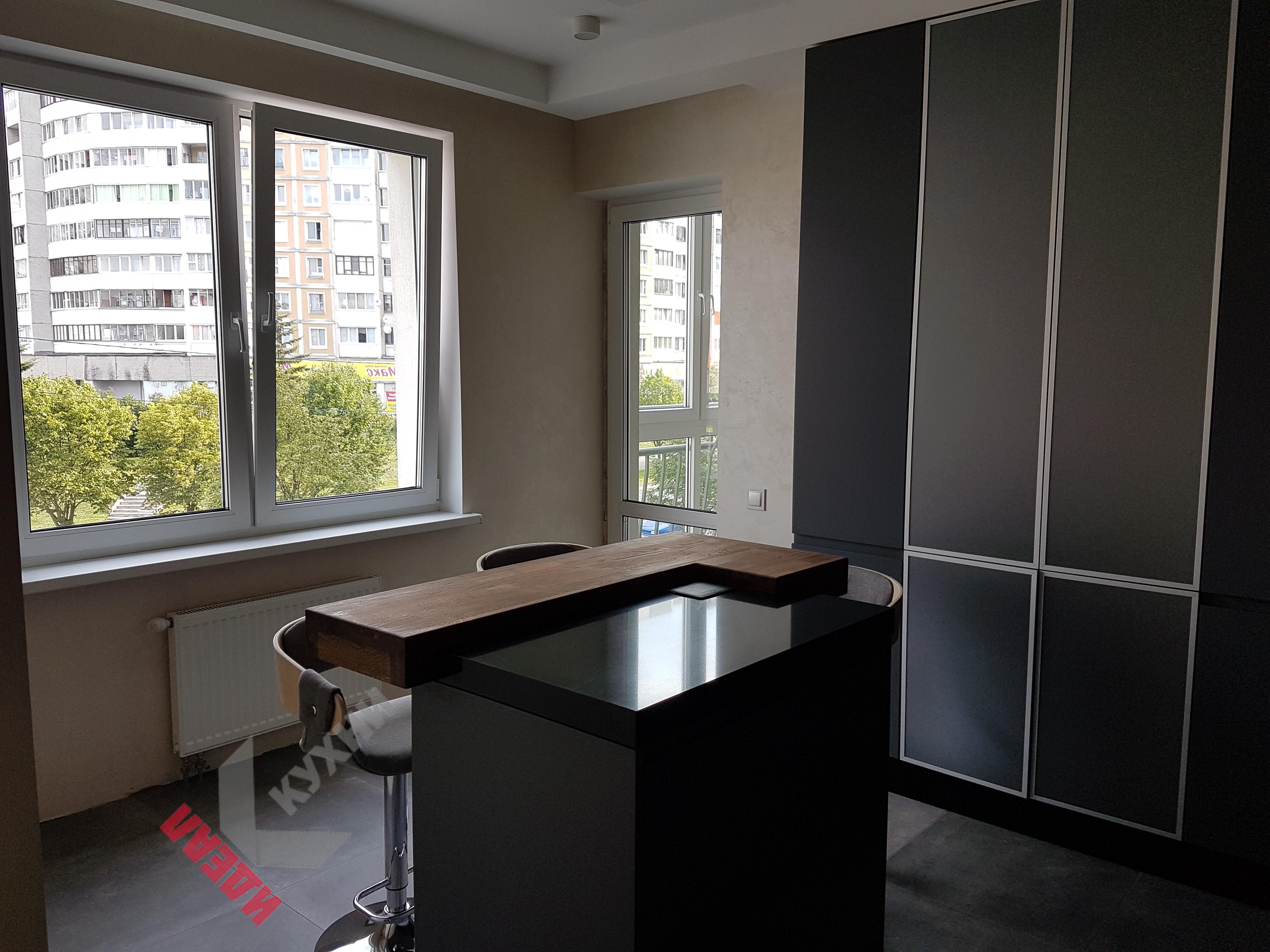 Удлиненные ручки из металла. Глухие фасады из матовой ЛДСП.