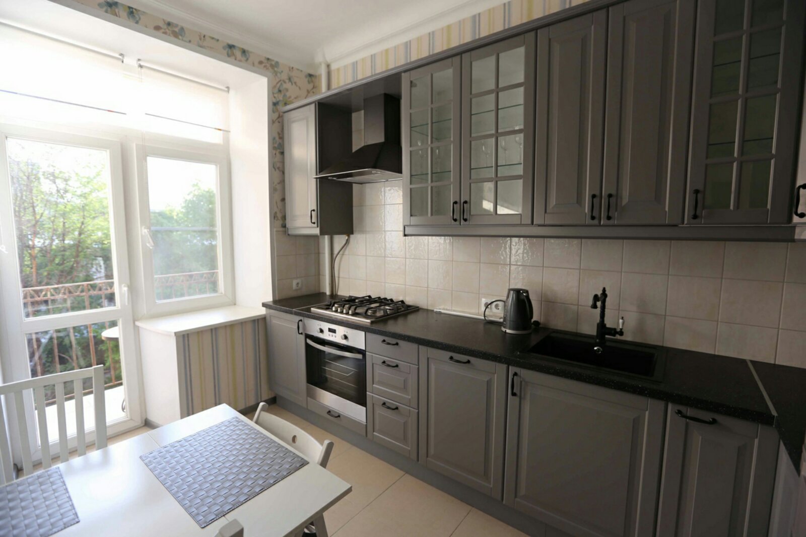 Фасады с фрезеровкой, витражная вставка. Ширина кухни 250 см.