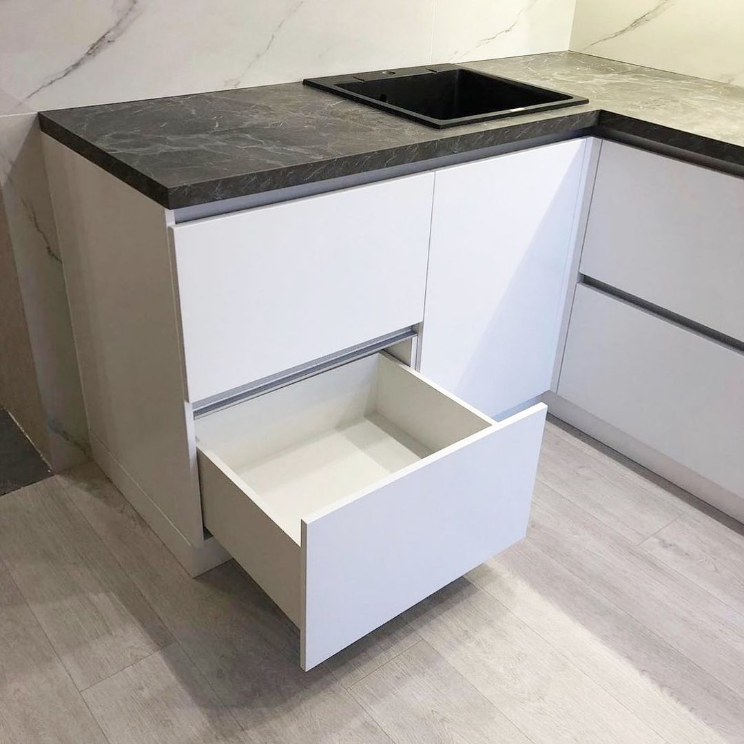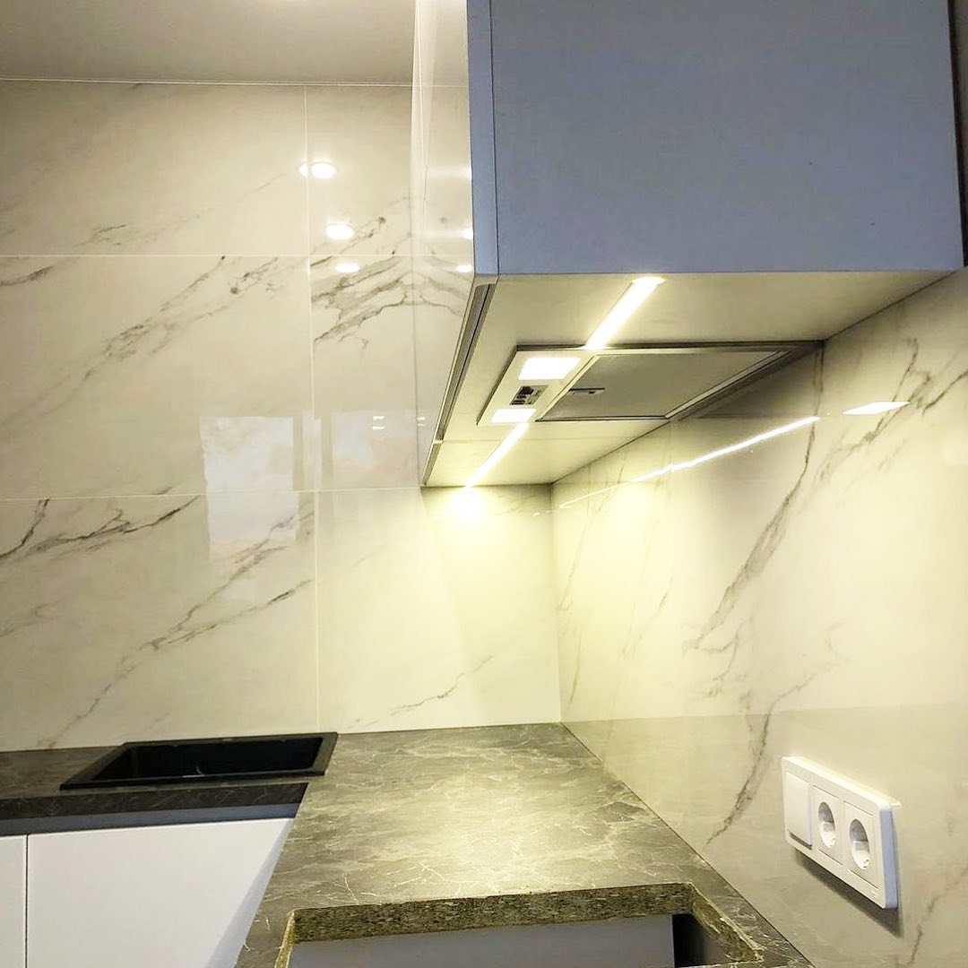 Матовые фасады без ручек. Подсветка. Навесные шкафы.