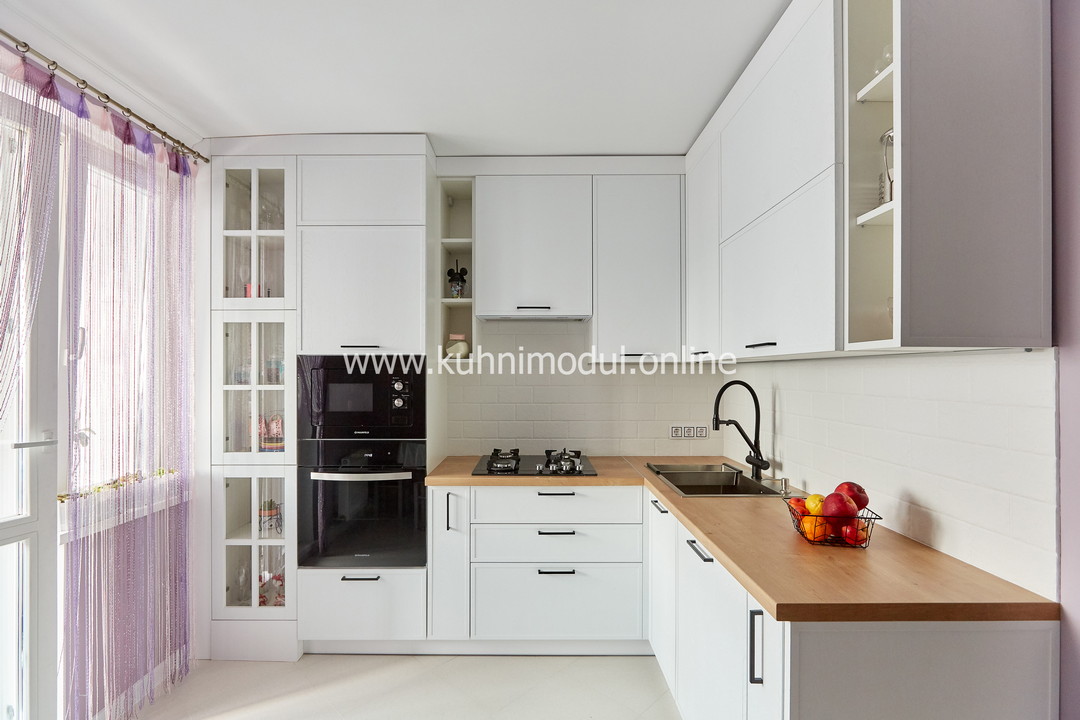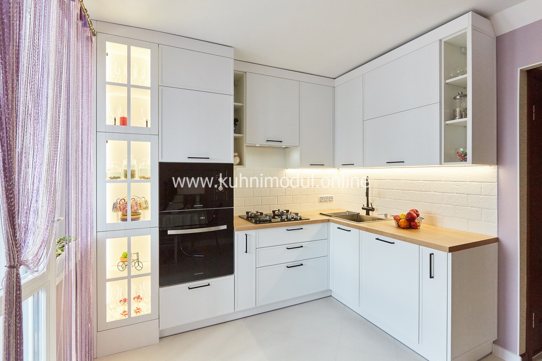 код 146447Угловая кухня в белом цвете с витринами и подсветкой.