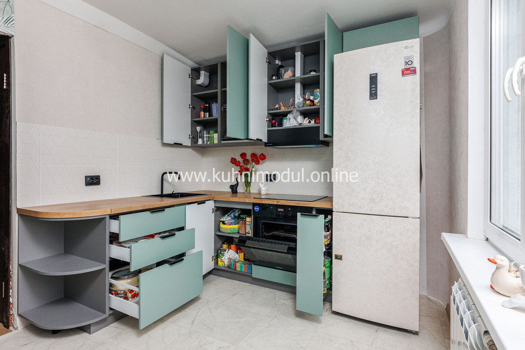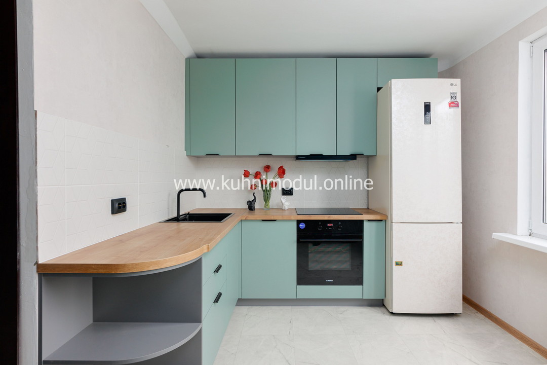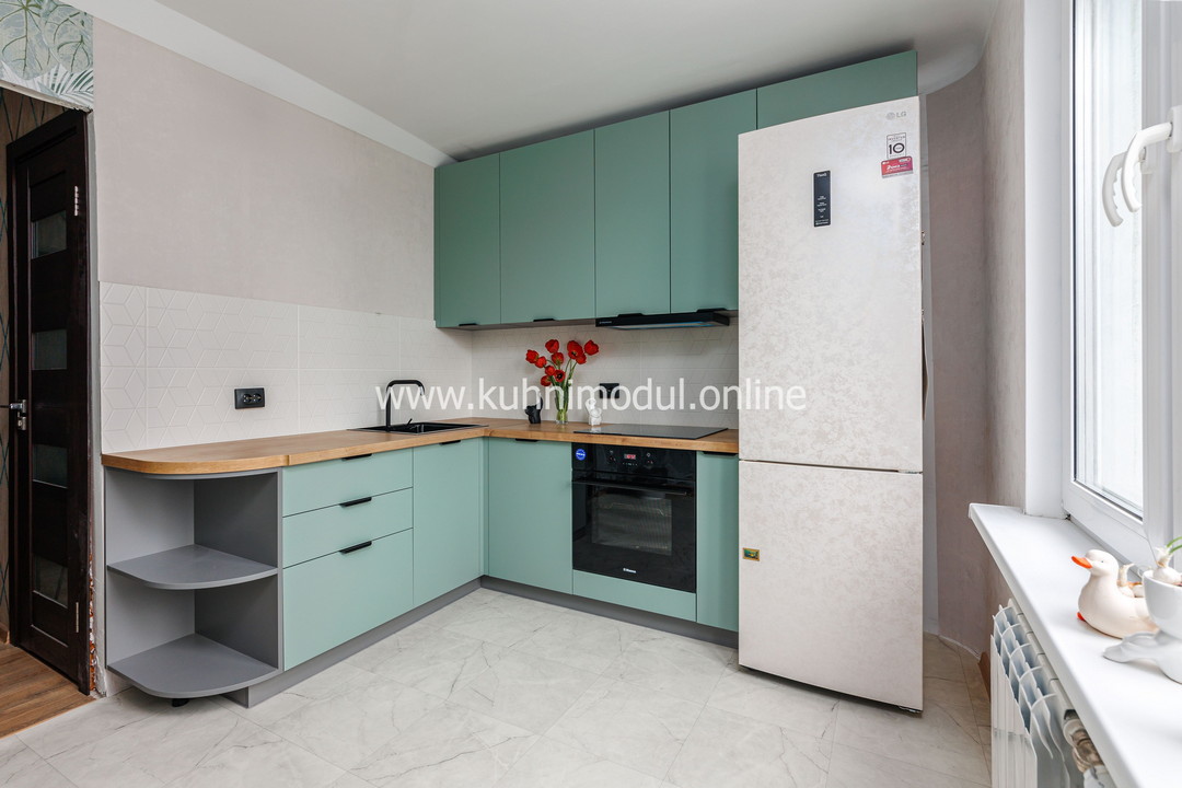 код 146452Угловая кухня в зелёном цвете с открытыми полками.