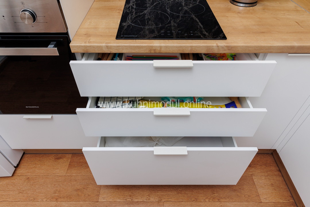 Комплектация: выдвижные ящики Quadro, толкатель Maco Push-to-Open с адаптером, газлифт GTV, петли GTV с доводчиками, столешница из ЛДСП.