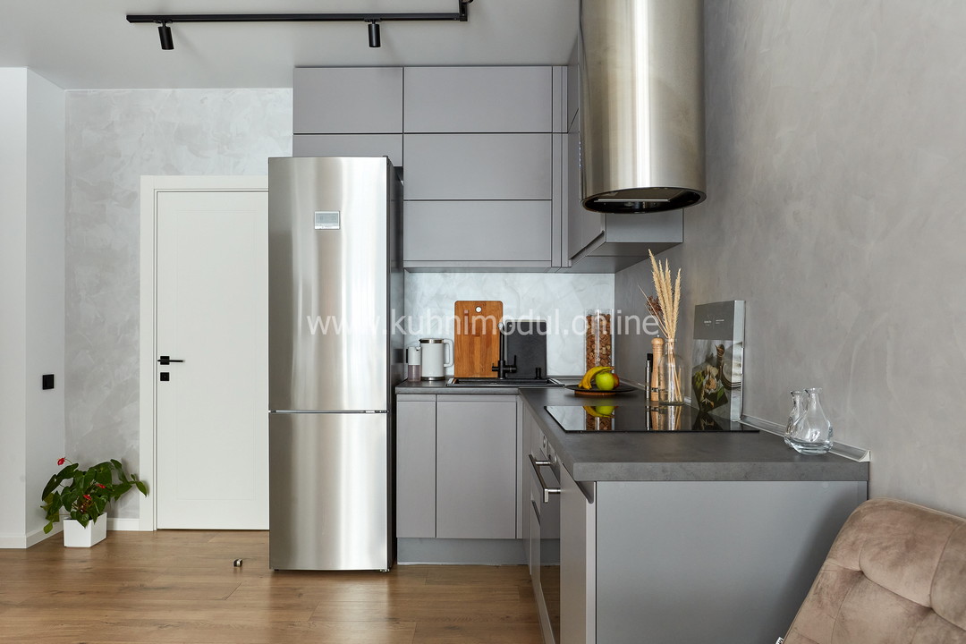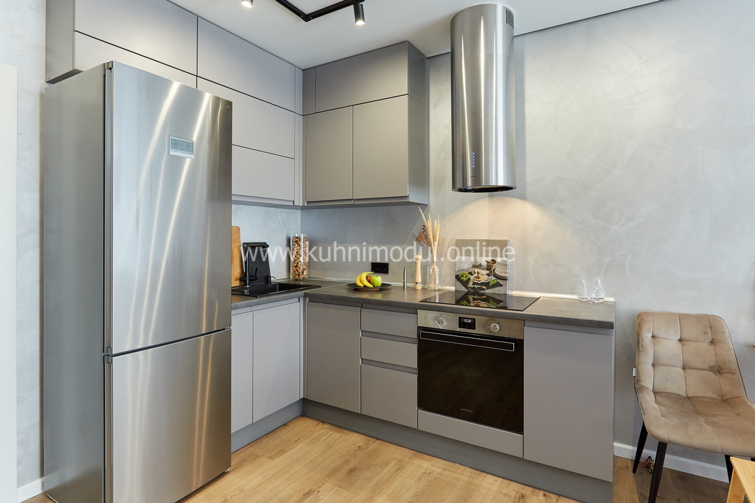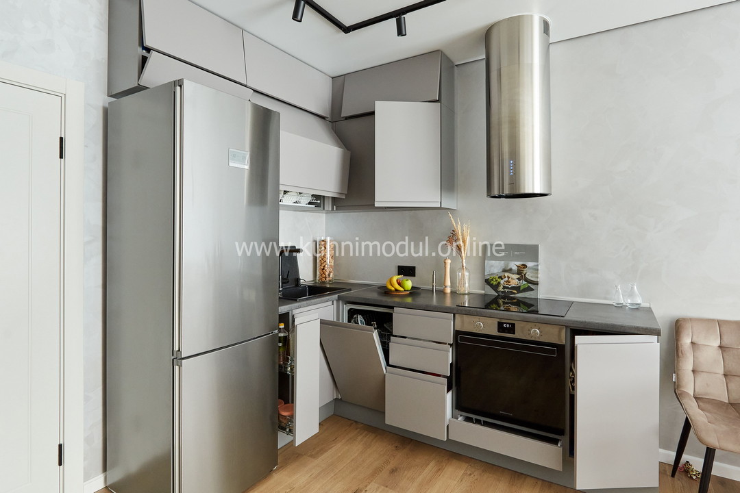 Угловая кухня 150х170 см с темными и светлыми фасадами.