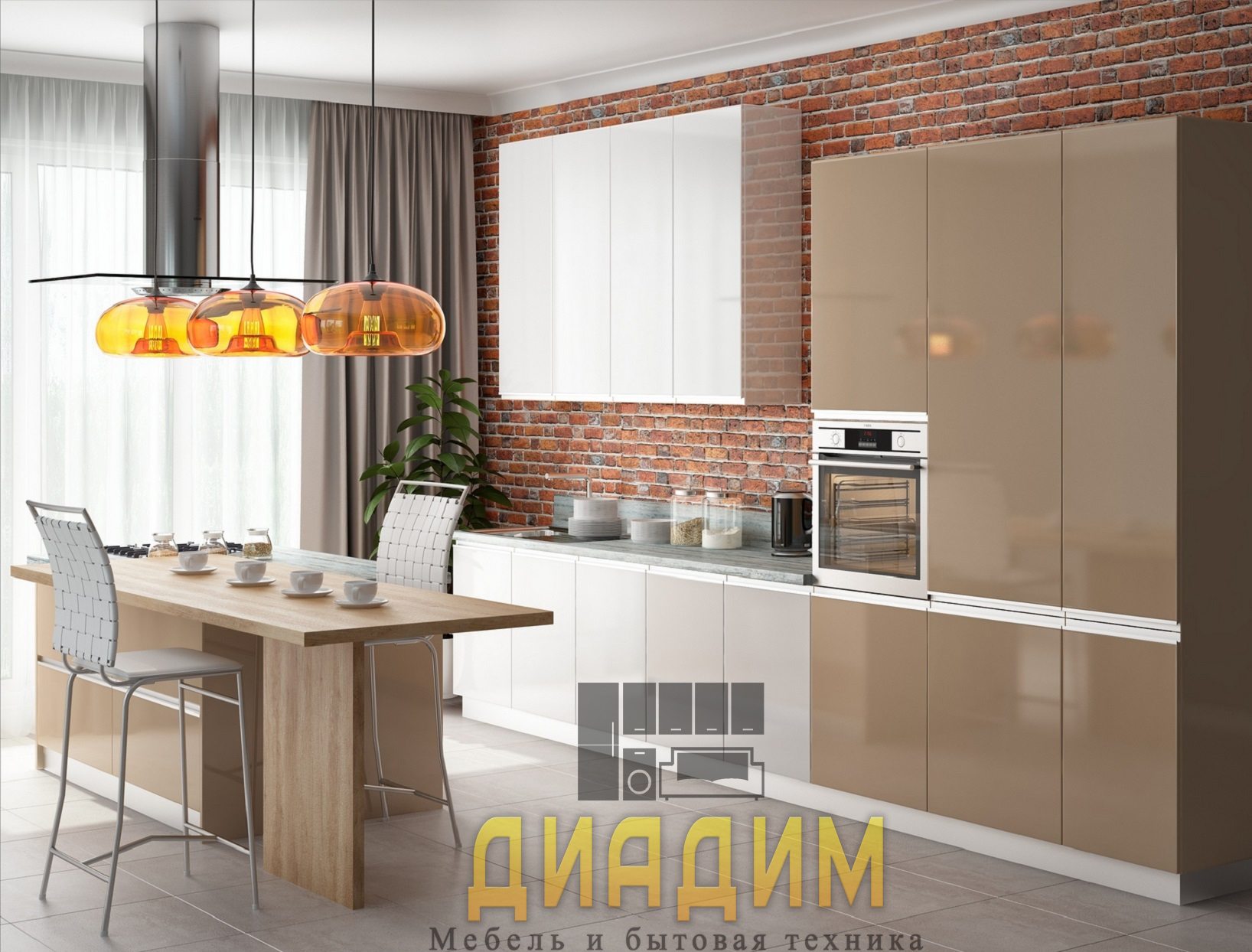 код 95302Белый и кофейный цвета фасадов. Легкие переливы. Стол светлого древесного окраса.