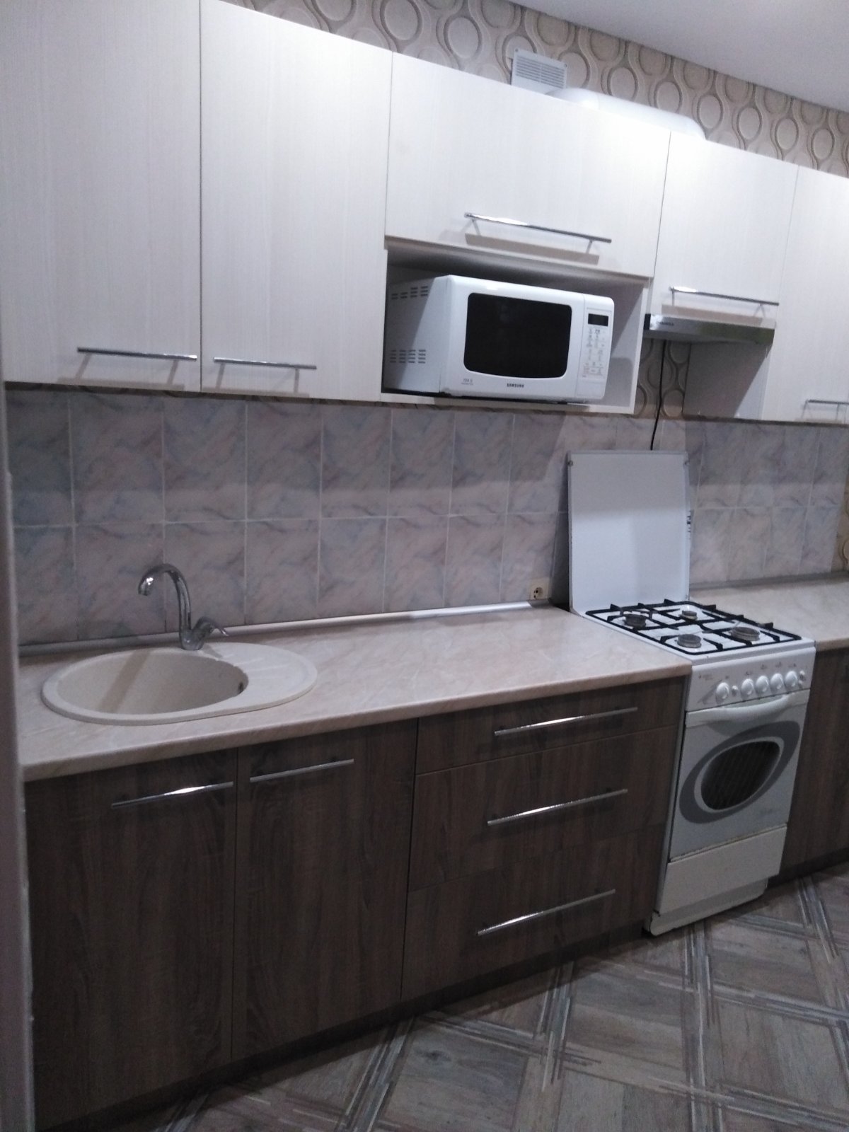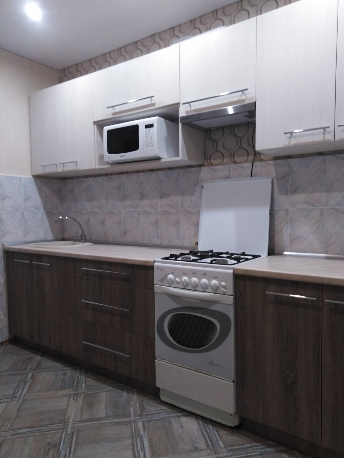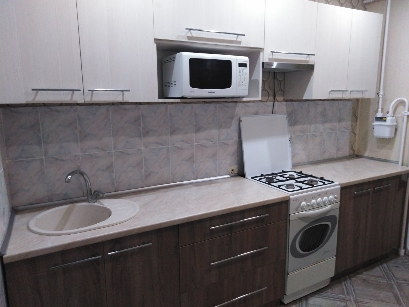 Кухня светлая с шириной модулей 60 см. Ниша под накладную мойку