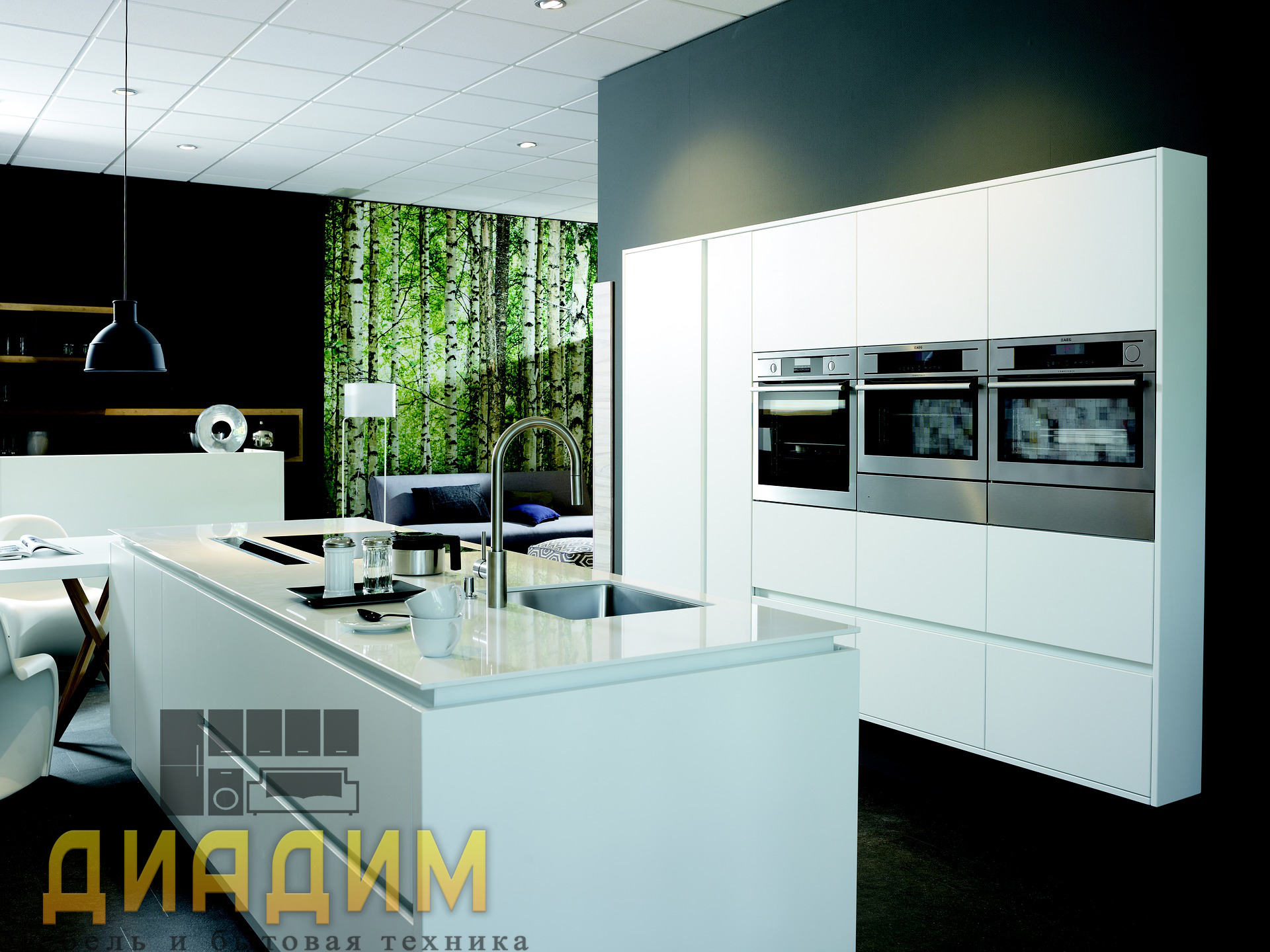 Матовая белая расцветка данной модели визуально увеличивает пространство и «освежает» его. Фасады гладкие на ощупь. Столешница имеет глянцевую поверхность. Модульная конструкция включает остров прямоугольной формы. Общая картина смотрится просто, но в то же время современно.