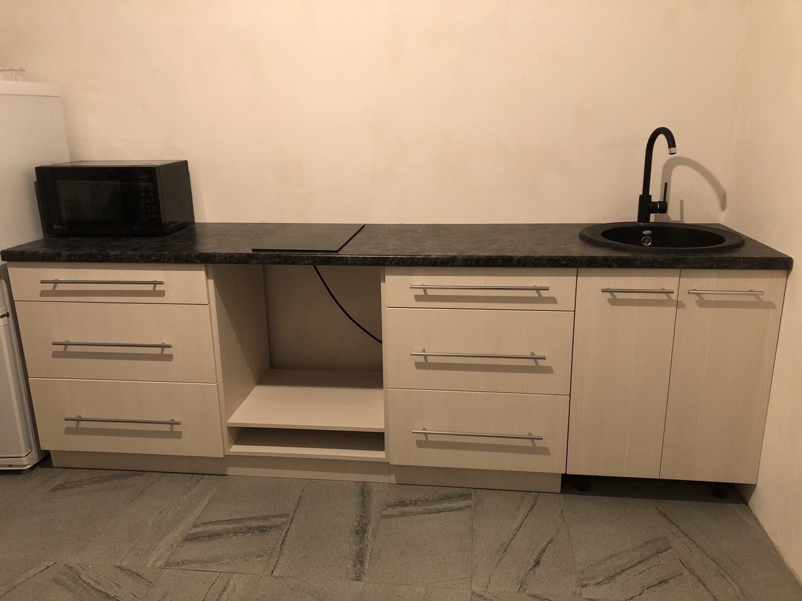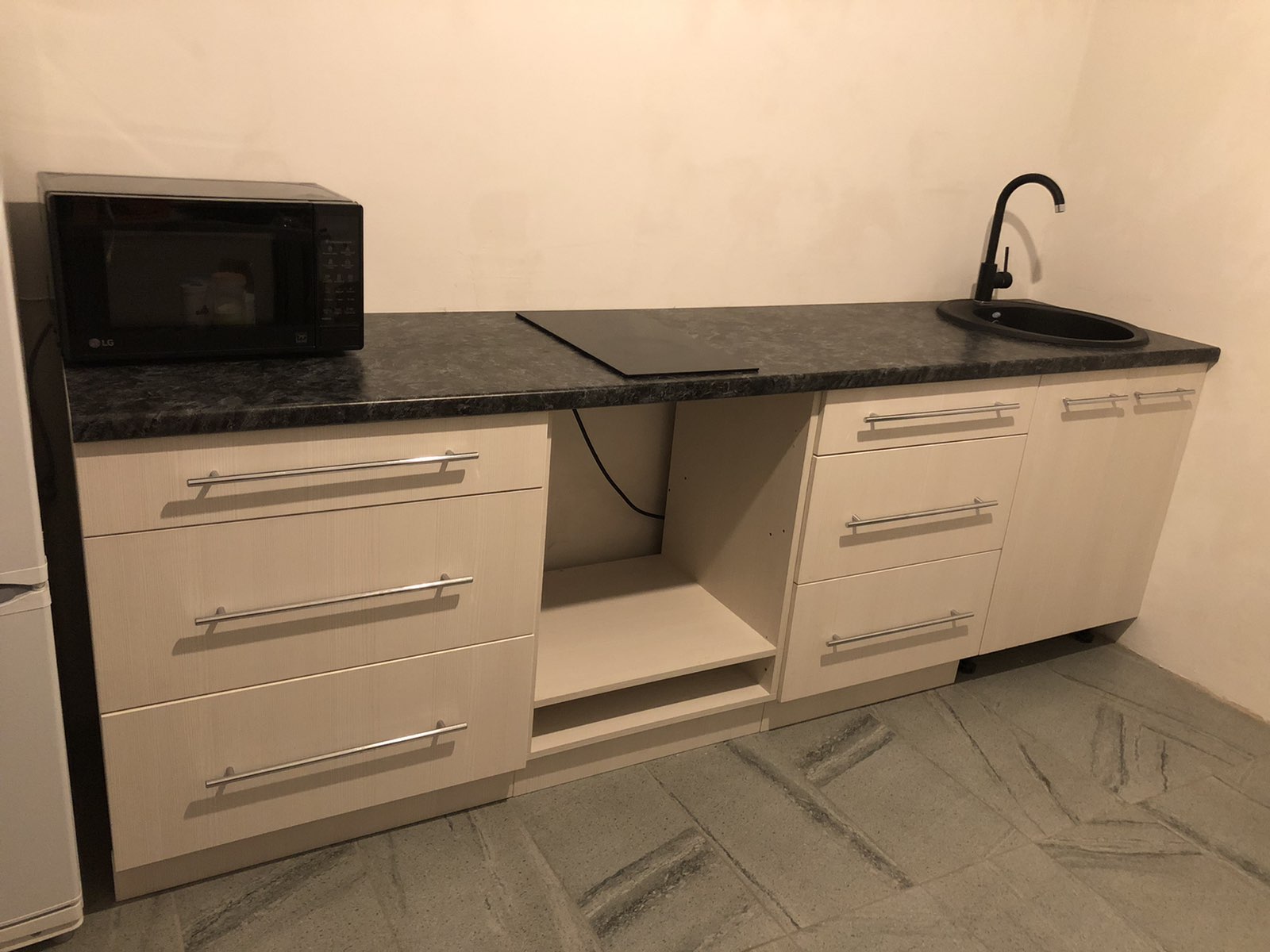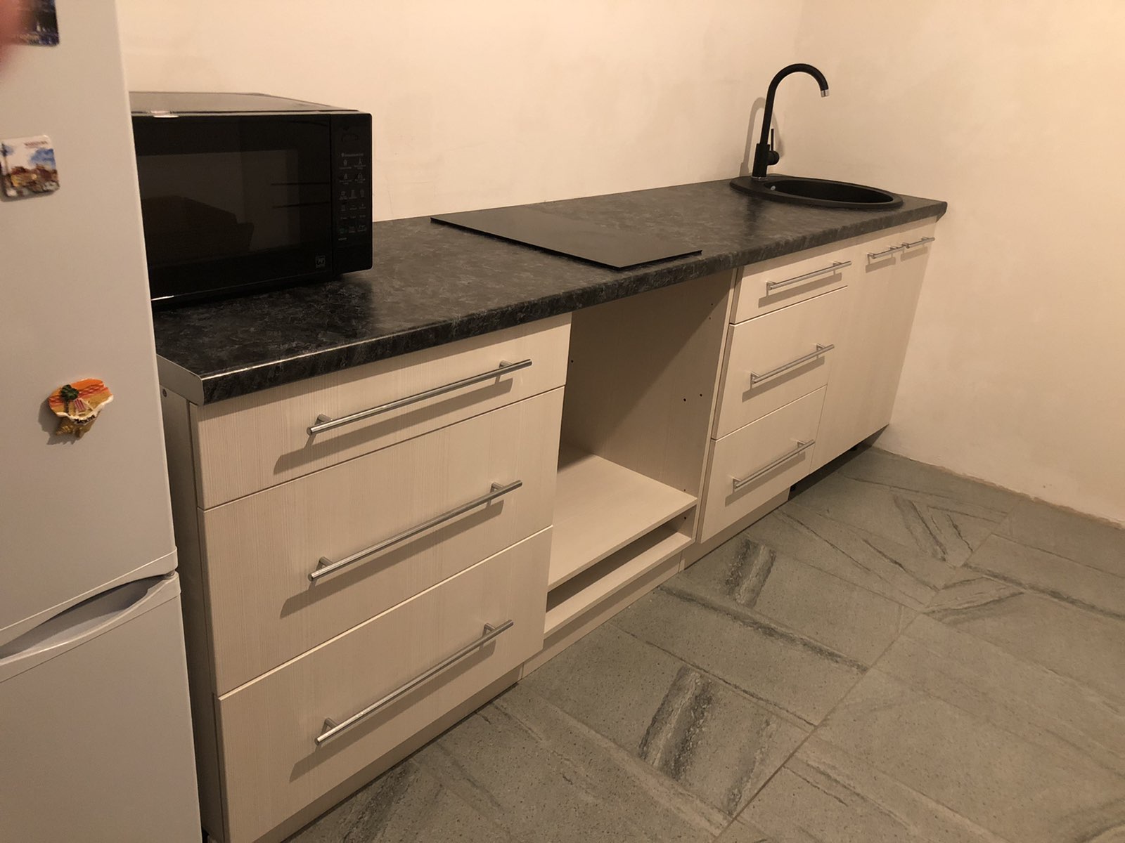 Длина кухни: 2.8х1.4 м + 2.2 м. Материал фасада: ЛДСП.