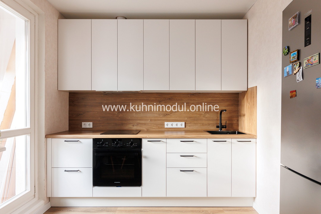 Двухметровая кухня с корпусом из ЛДСП и фасадами из МДФ.