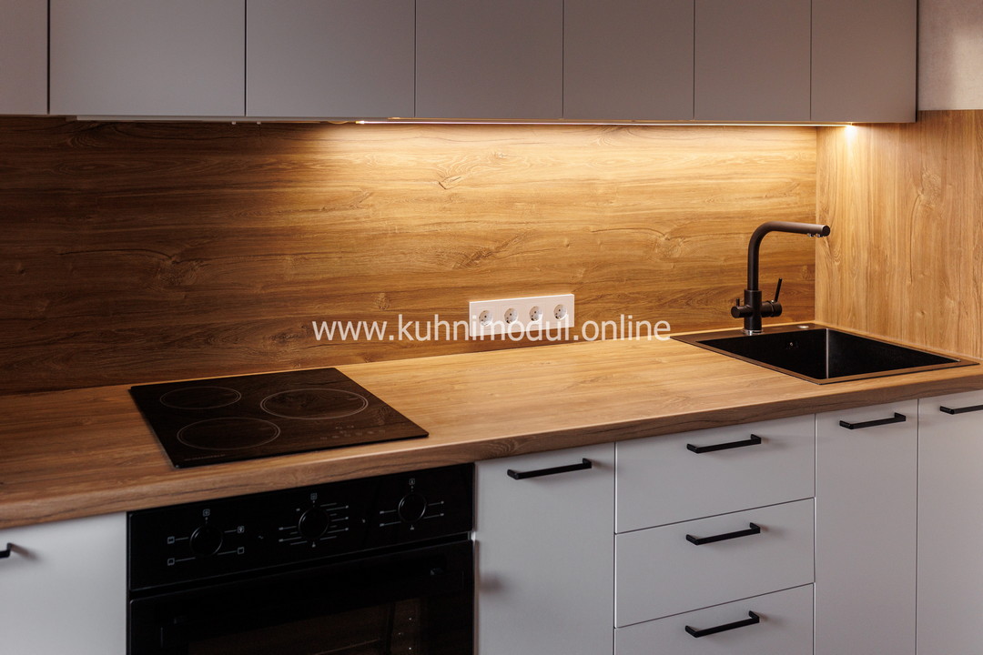 Кухня оснащена подсветкой рабочей зоны, что обеспечивает отличное освещение для готовки и позволяет удобно работать даже в условиях ограниченного света. Каждая деталь продумана для вашего комфорта: выдвижные ящики QUADRO, петли GTV с доводчиками обеспечивают плавное и тихое закрытие дверок, добавляя функциональности и удобства в использовании.