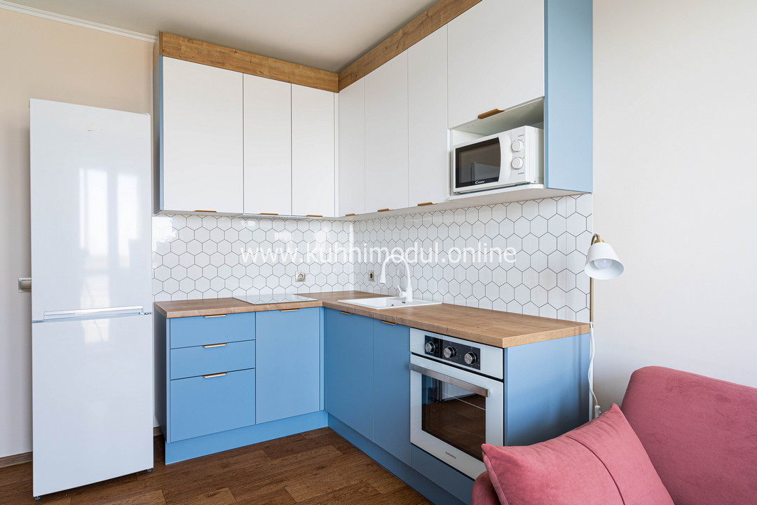 код 146445Угловая кухня-студия с матовыми фасадами цвета белый/голубой океан.