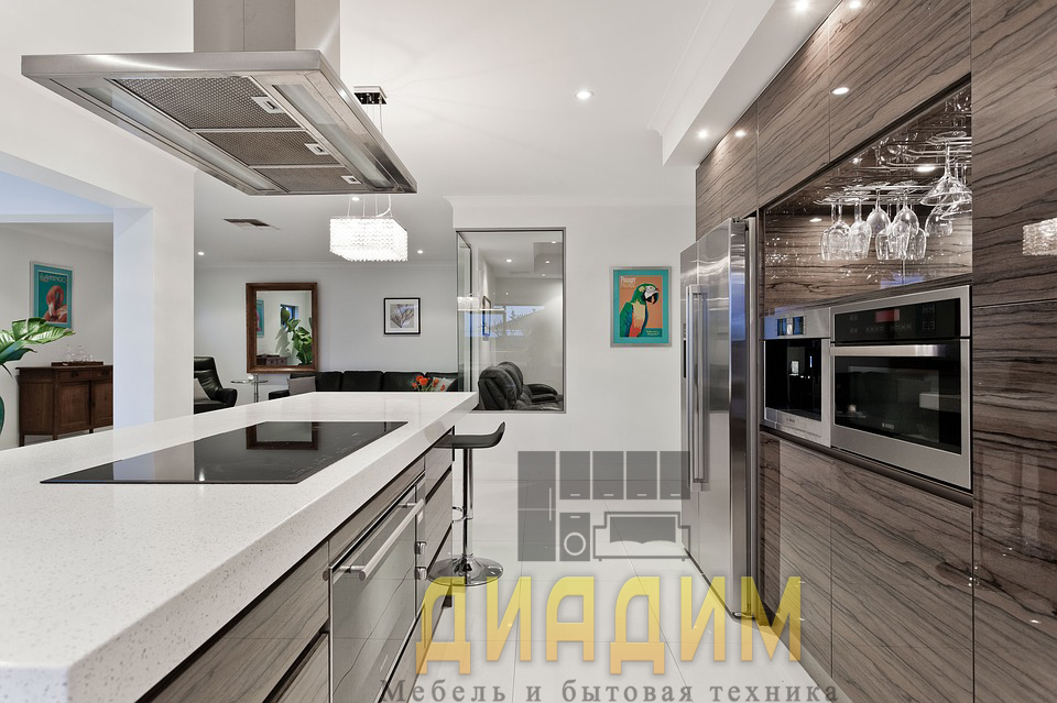 Модульная кухня представлена в коричневом глянцевом цвете с древесным декором. Столешница белого окраса, фурнитура – металлического. Остров прямоугольной формы. Общий вид смотрится благородно и стильно.