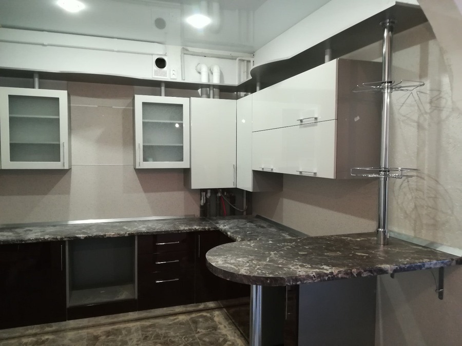 Современный и функциональный гарнитура с высокими шкафами и компактной барной стойкой.