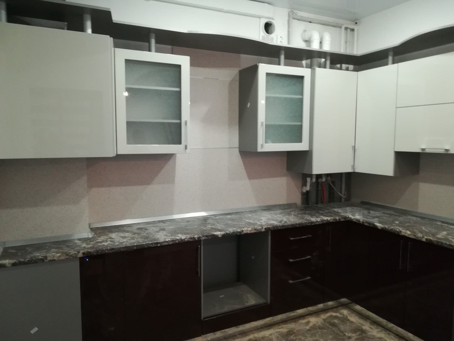 Угловая кухня из ЛДСП. Навесные шкафы декорированы стеклами.