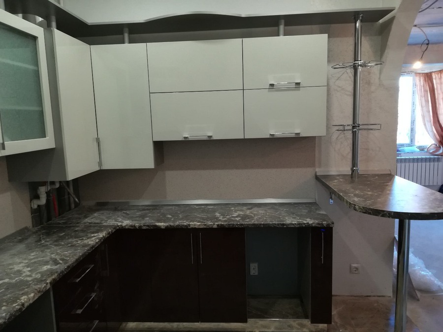 Готовый гарнитур с комбинированными фасадами из ЛДСП. Ширина кухни 140 см.