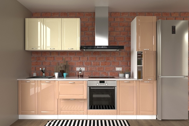 Локоничная модульная кухня представлена в нежных оттенках. Имеет стильный дизайн и привлекательную глянцевую поверхность. Предусмотрено пространство для установки мойки и плиты. Есть возможность заказать дополнительные элементы коллекции.
