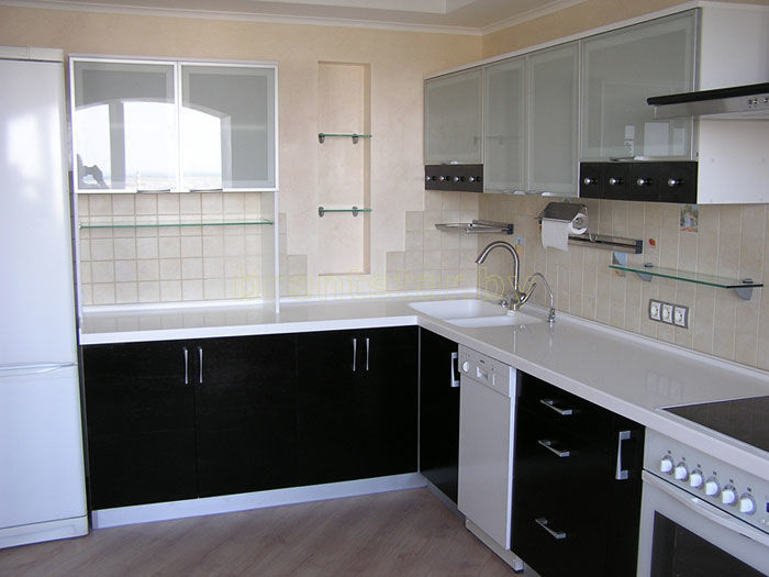 Стильный кухонный гарнитур имеет удобную угловую конструкцию. Подобное расположение позволяет выполнять установку данного набора даже на самых маленьких кухнях. Модель отличается современным дизайном, который сочетает белые и черные цвета. Полупрозрачные фасады подвесных шкафчиков делают конструкцию легкой и удобной.