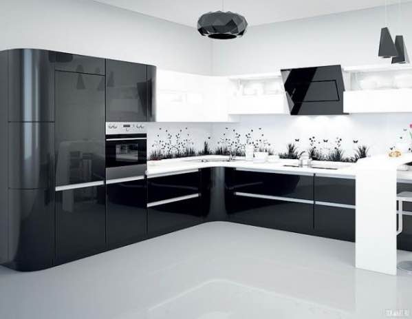 Черно-белая угловая кухня в стиле хай-тек в глянцевых закругленных фасадах с врезными ручками. Низ и шкаф для встроенной техники - черные, столешница, навесные модули и примыкающая барная стойка - белоснежного цвета. Конечная цена рассчитывается исходя из материалов и в расчете на метр погонный.