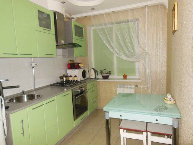 код 88524Приятный матовый светло-зеленый оттенок фасада с двумя витринами. Ручки рейлинги.