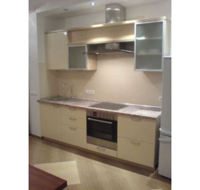 Набор кухонной мебели, благодаря глянцевым бежевым фасадам и необычный столешнице, выглядит очень стильно и современно. Прямая конструкция позволяет устанавливать кухню даже в небольшие помещения.