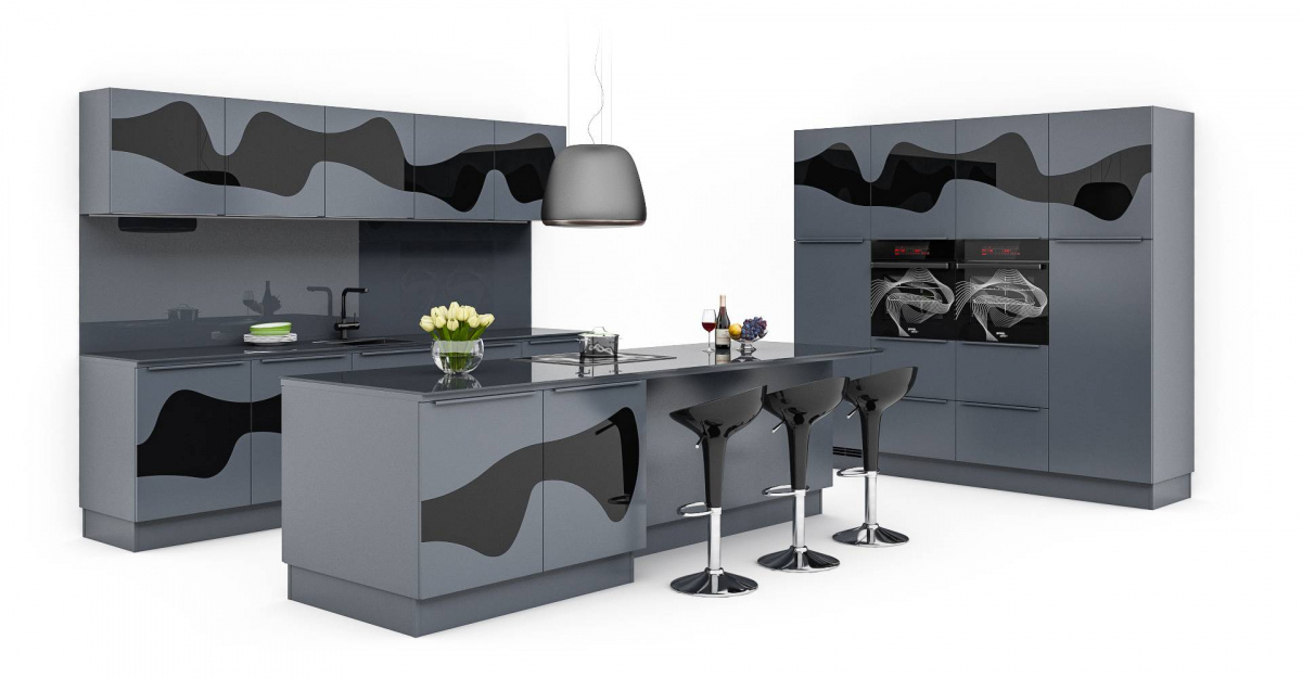 Кухня состоит их трех отдельных модулей: острова, выполняющего роль обеденного стола, прямого модуля с навесными шкафами и напольными тумбами, а также большого шкафа для встраиваемой техники. Серые фасады дополнены асимметричными декоративными вставками черного цвета и удобными ручками.