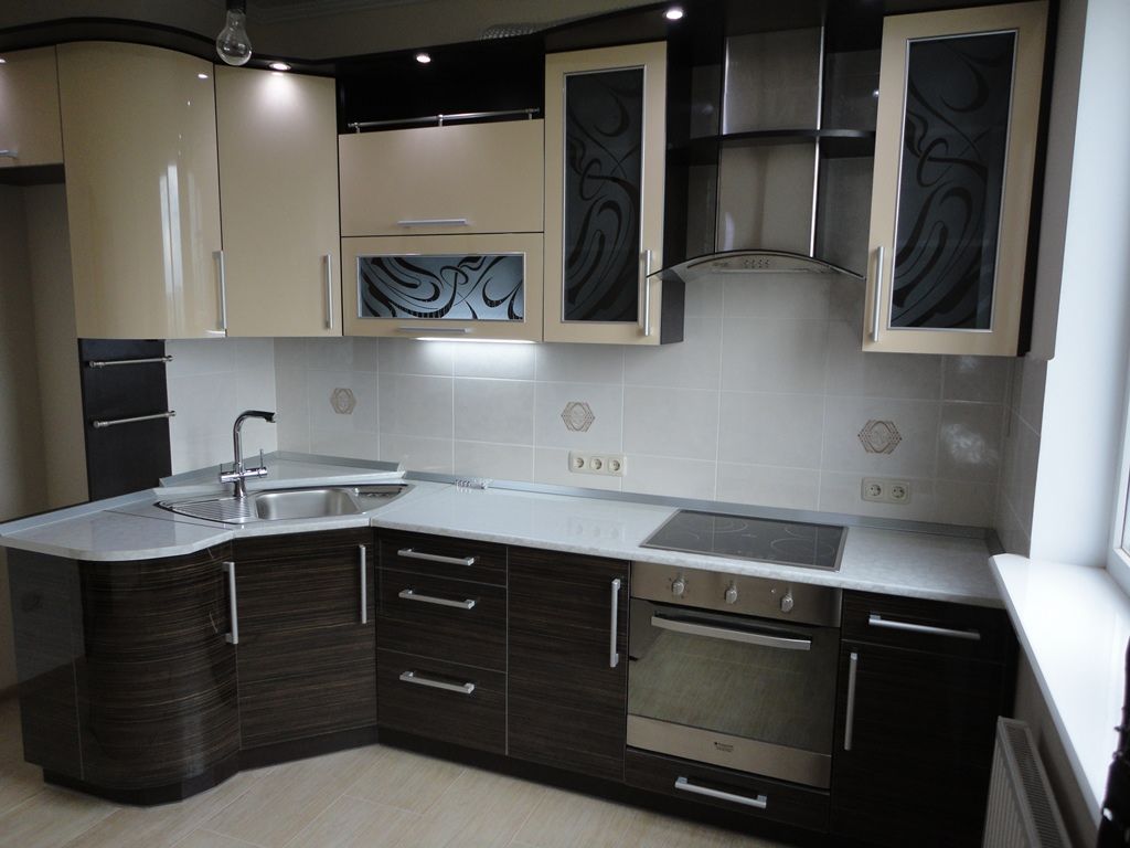 Изысканная угловая кухня обладает компактными габаритами и современным функицоналом. Фасады кухни комбинированные, с креативным узором на верхних остекленных створках. Цветовая схема кухни идеально смотрится на глянцевых фасадах.