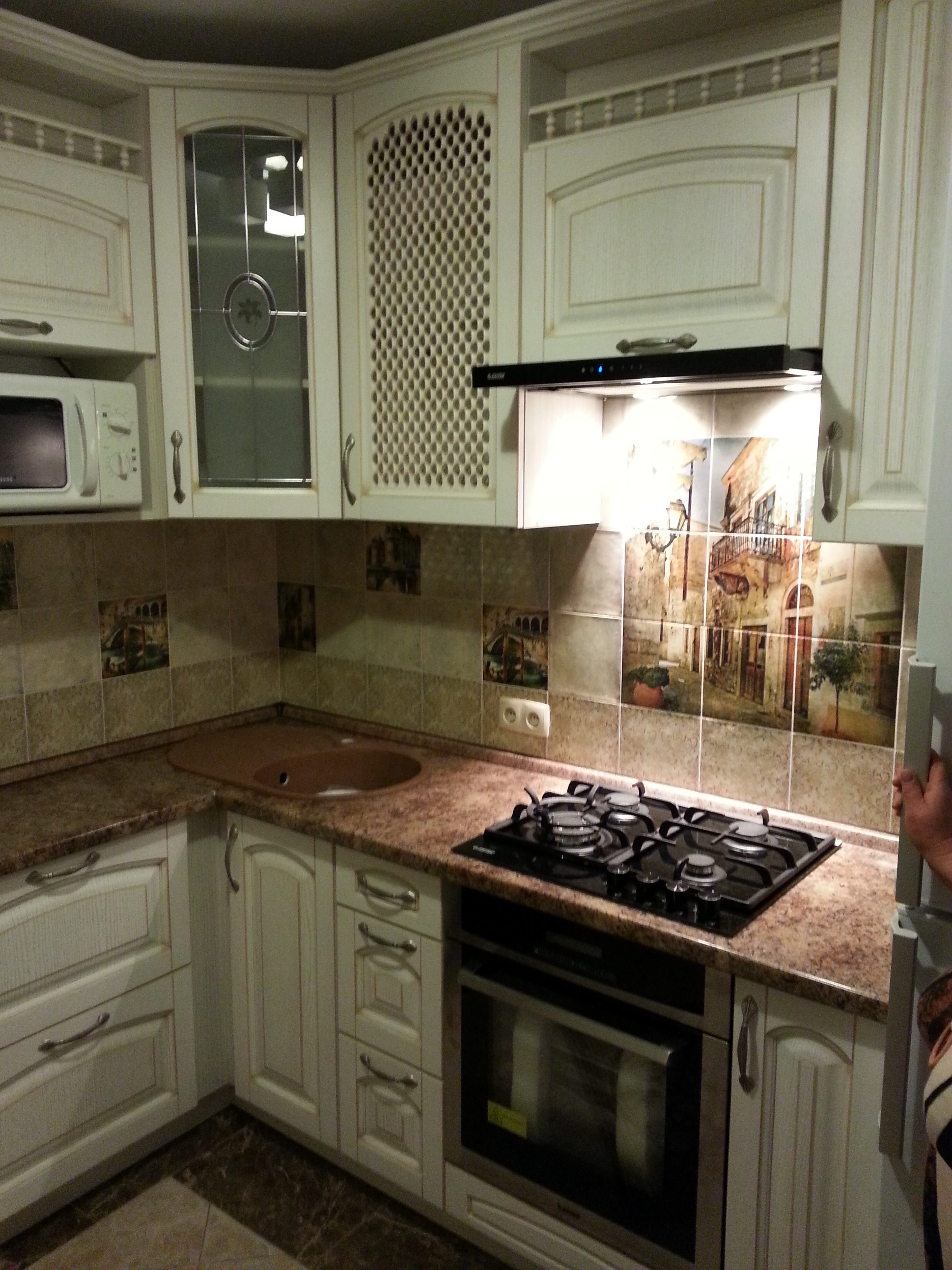 Угловая кухня с компактными подвесными шкафчиками, комбинированные фасады, удобная фурнитура.