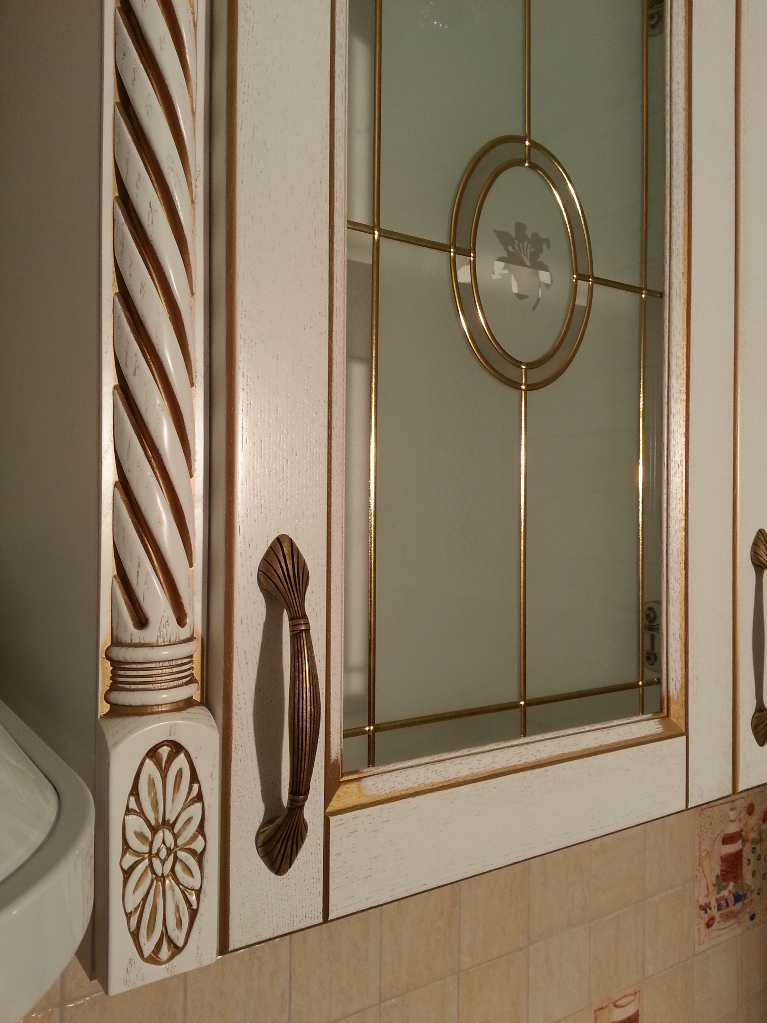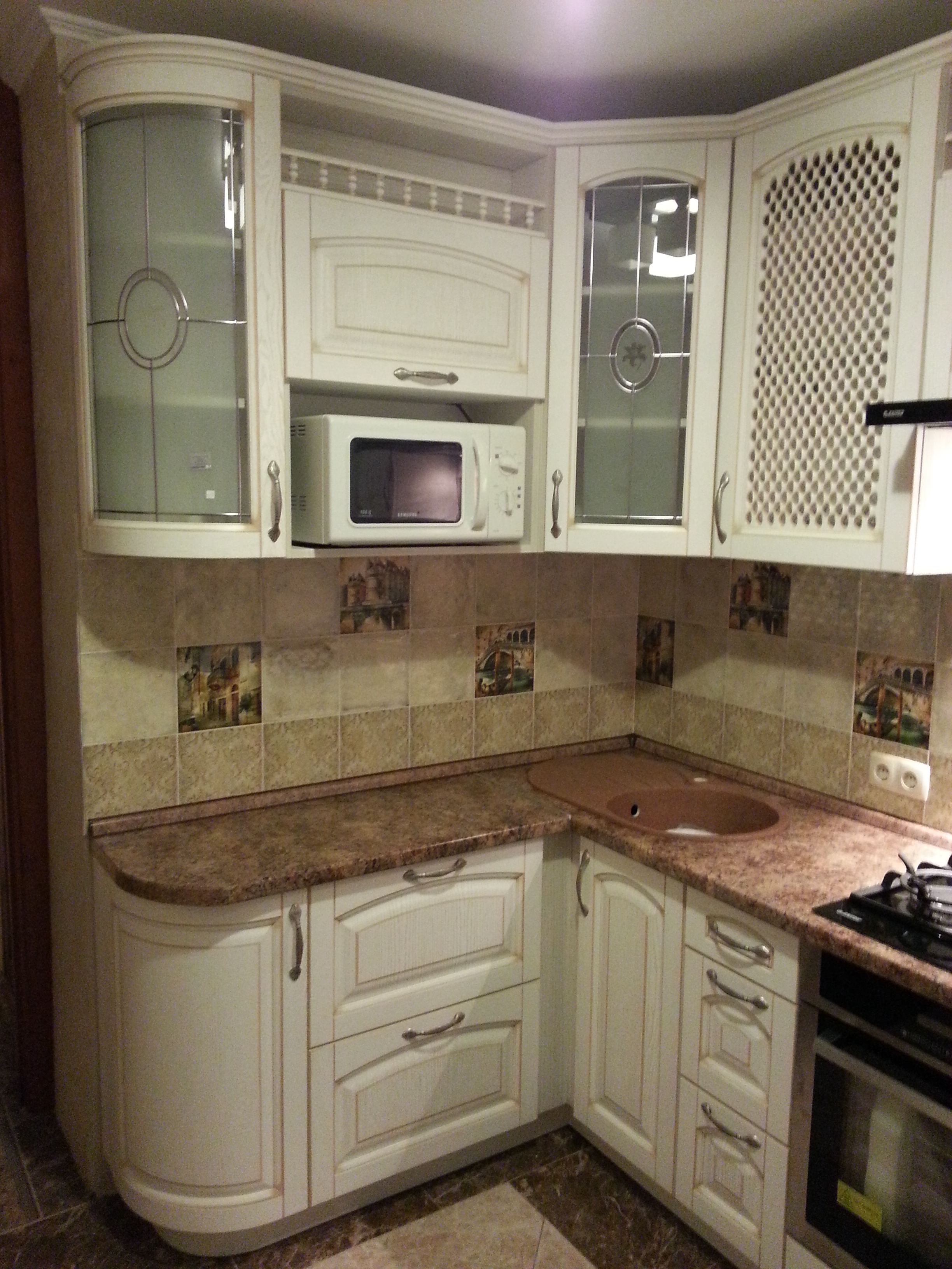 код 86696Угловая кухня из массива. Остекленный радиусный торец и диагональ верха.