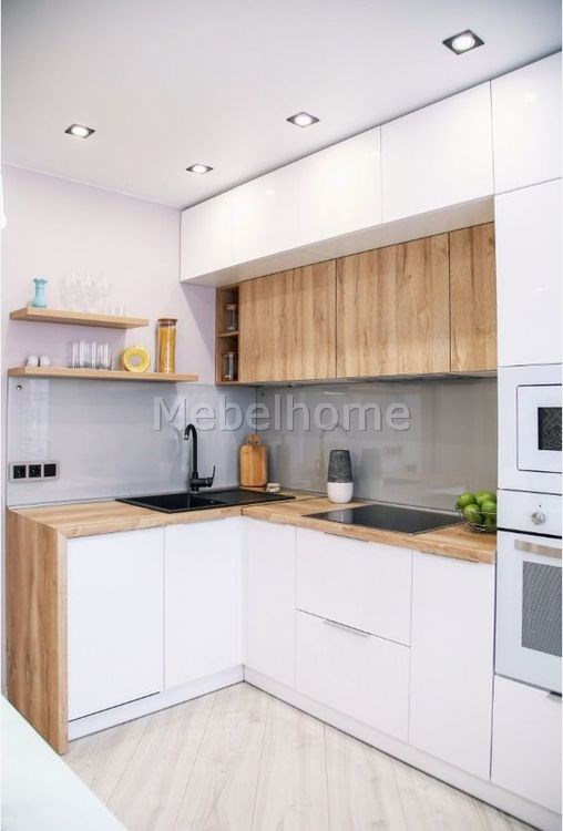 код 107384Сочетание белого цвета и дерева. Ниши для техники. Гарнитур дополняется навесным полками.