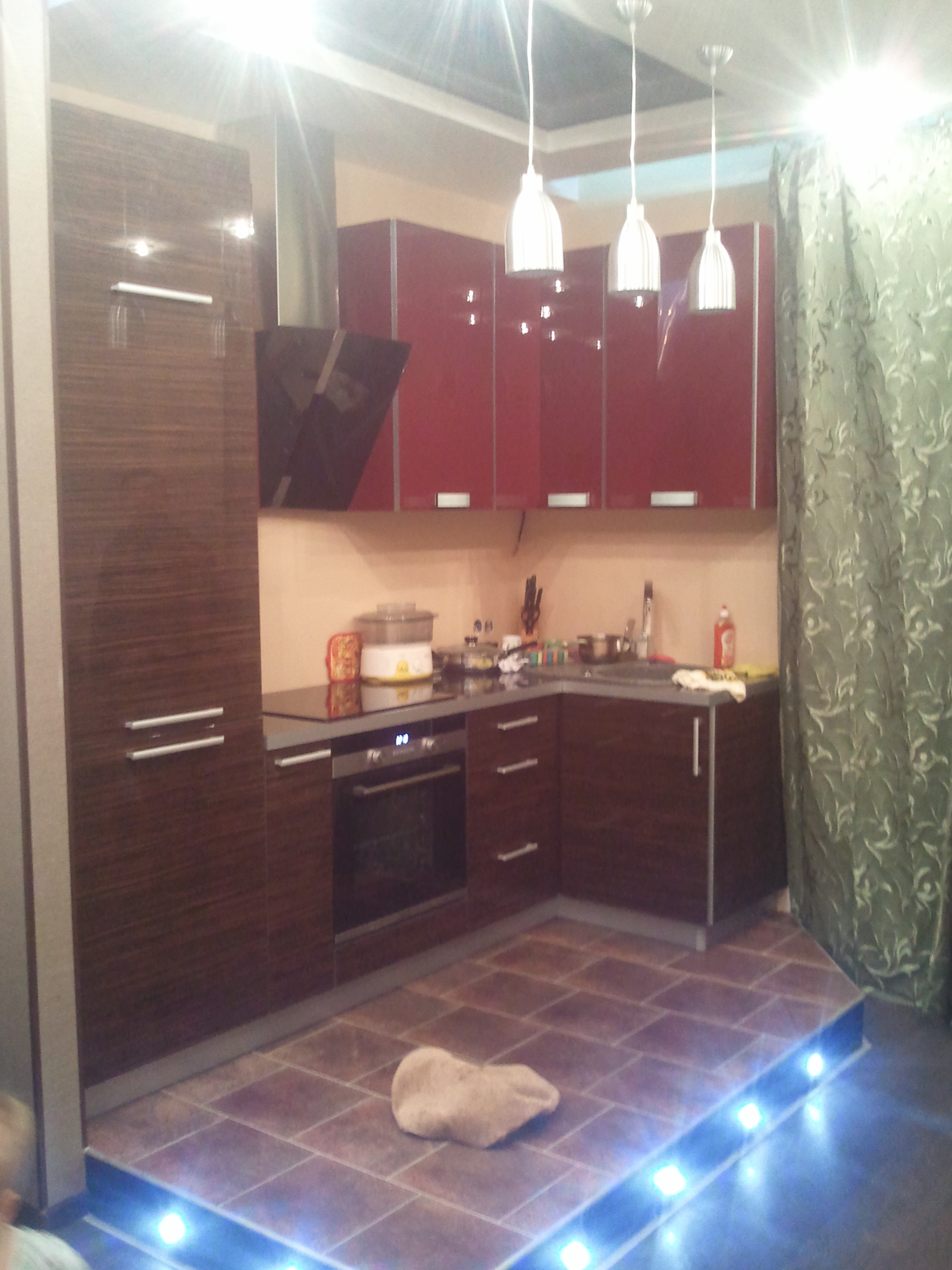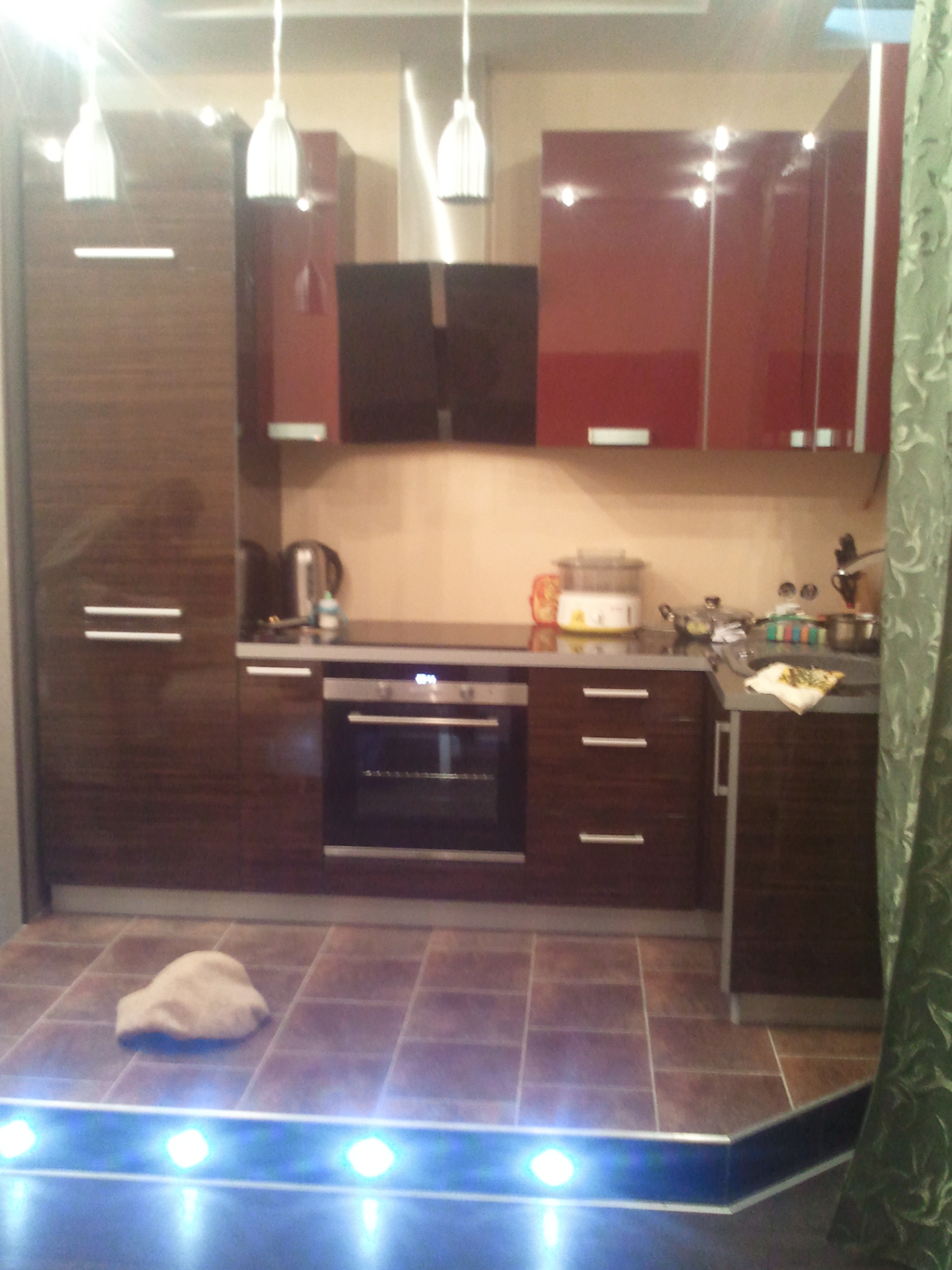 код 86651Фасады под дерево и из красного глянца. Ниша для встроенного холодильника. Серый цоколь.