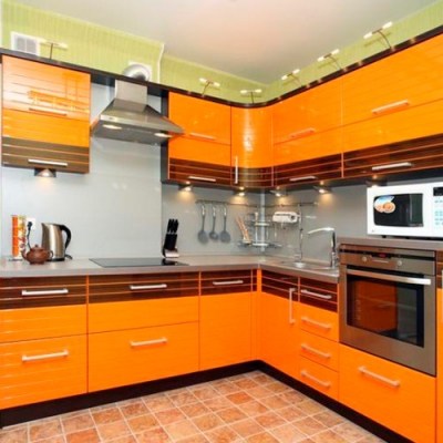 Стильная и функциональная оранжевая кухня с фасадами из шпона с эмалью оснащена множеством ящиком с современной и качественной фурнитурой Blum. Столешница постформинг достаточно широкая, поэтому не будет проблем с размещением на ней обилия продуктов и кухонных принадлежностей. Функционал кухни представлен ящиками и выдвижными шуфлядами с удобными ручками.