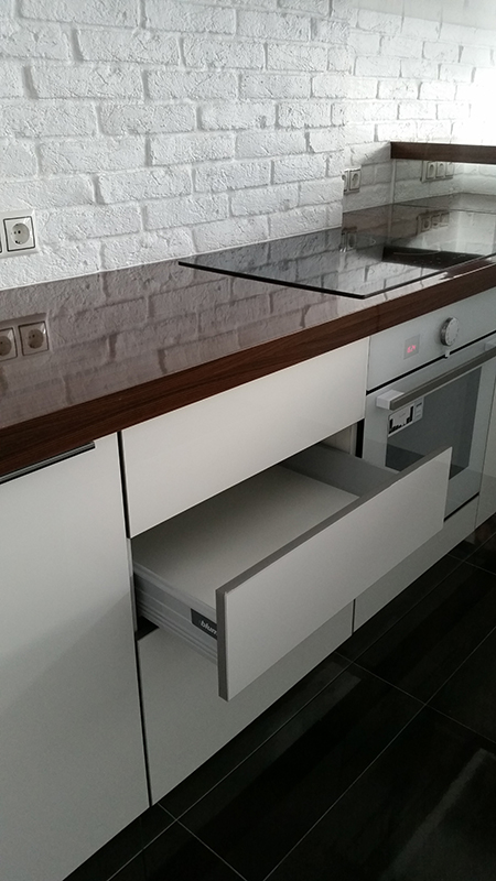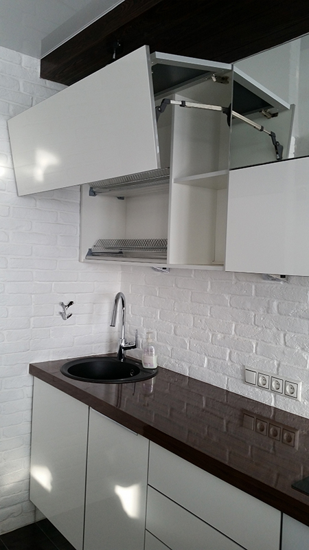 код 81141Белые глянцевые фасады без ручек. Столешница коричневая. Современная конструкция.