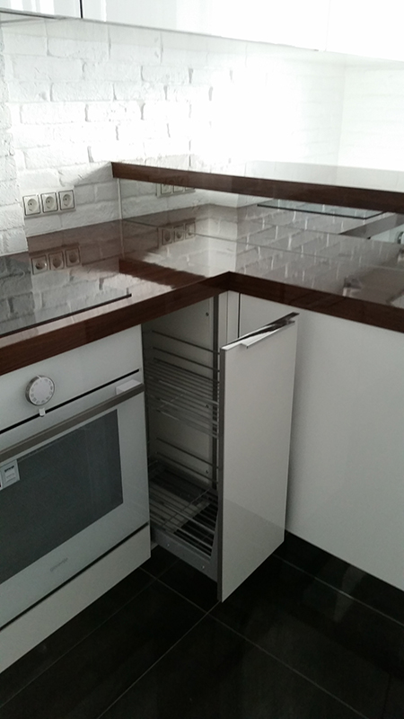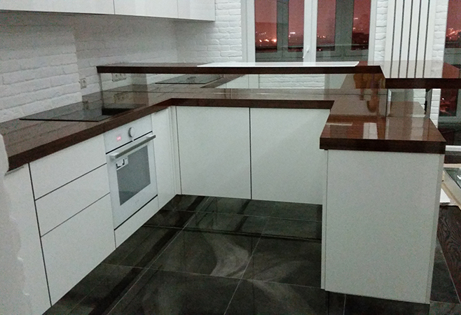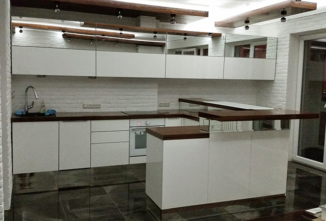 Коричневая столешница изготовлена в соответствии с современным дизайном, верхние шкафчики фасада оснащены стильными зеркалами для придания кухне уникальности.