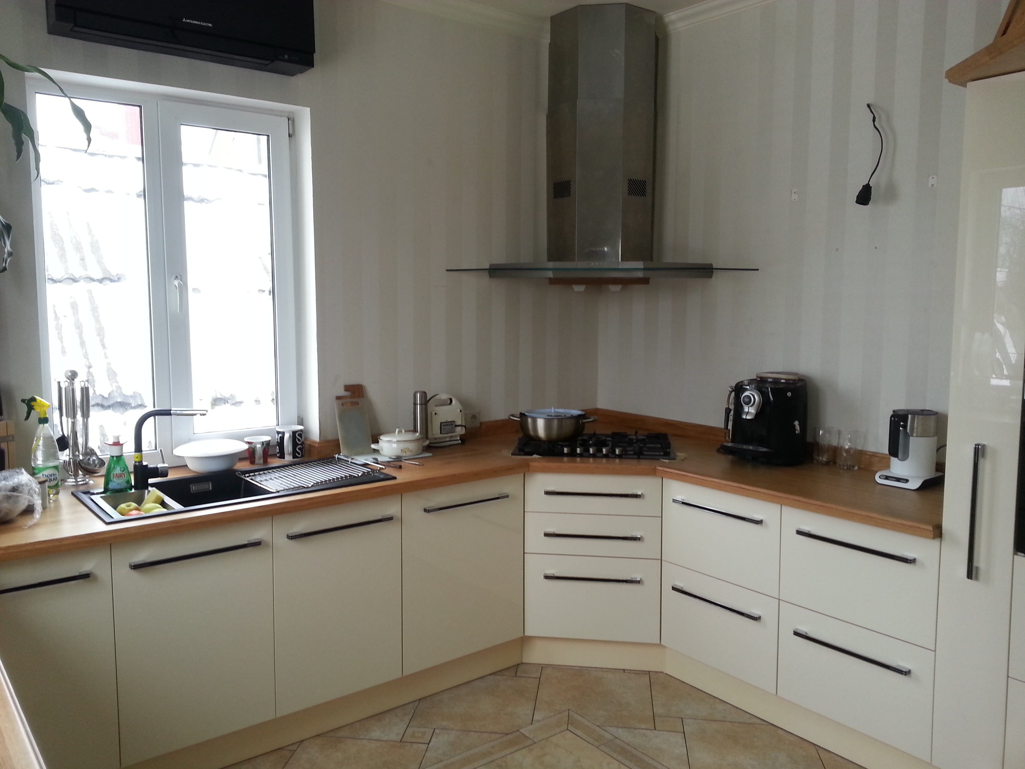 Матовые песочные фасады из акрила с широкими ручками-рейлингами, столешница под дерево. Полное отсутствие навесных модулей и максимальная функциональность. Духовой шкаф с выдвижным встроенным стеллажом. Варочная поверхность расположена в диагональном углу.