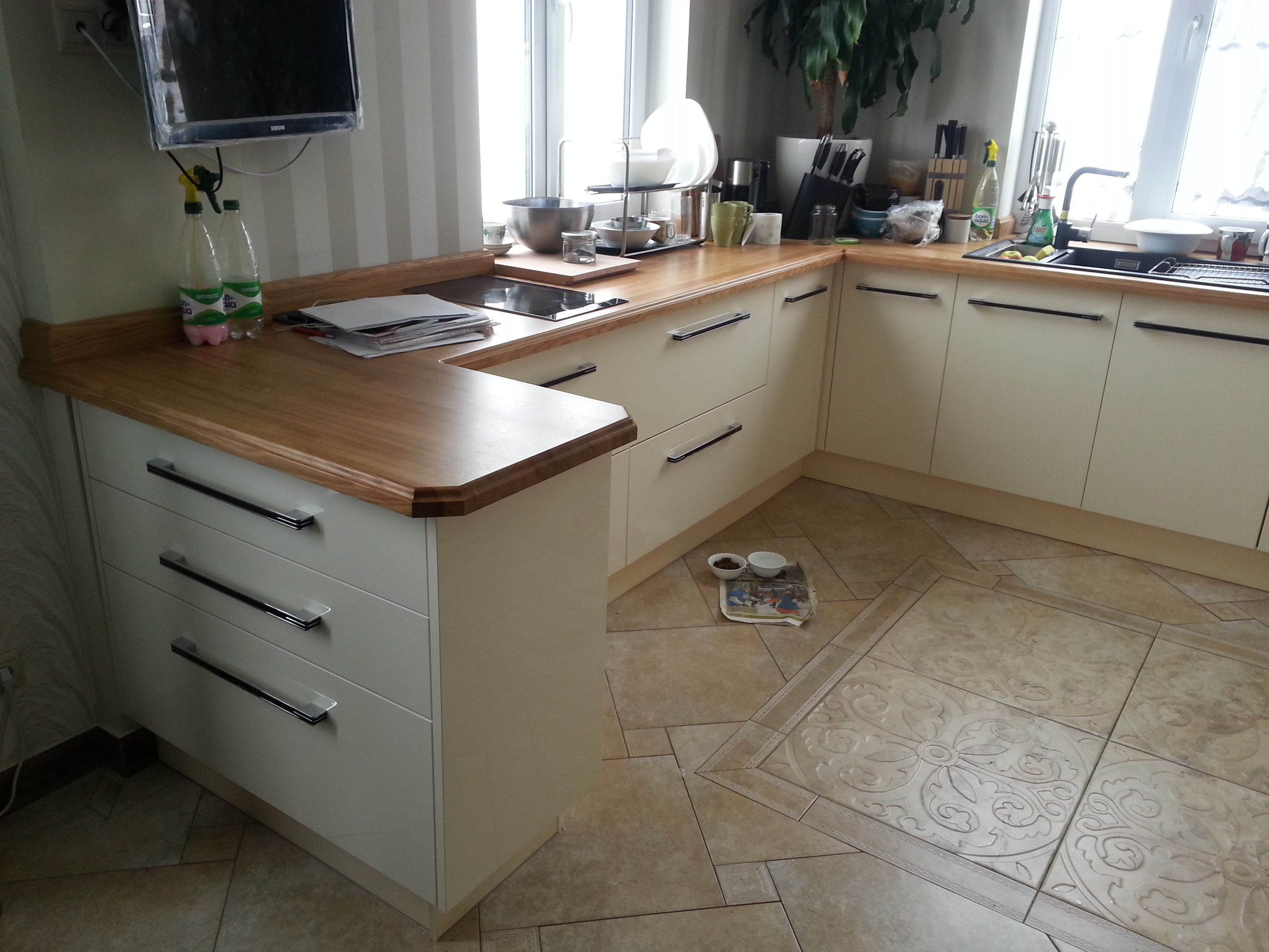 код 86652Белый матовый фасад. Столешница под дерево с резной кромкой. Диагональный угол.