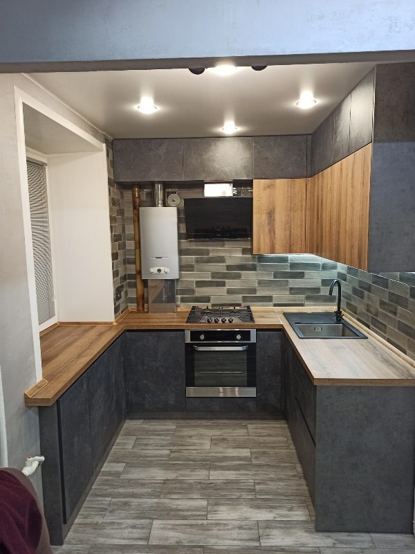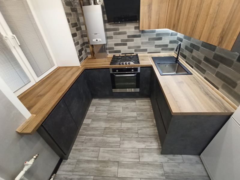 Темные и светлые фасады из пленочной МДФ. Ширина кухни 230 см.